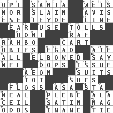 ACROSS 1. Elect 4. Before Barbara or Clara 9. Moistens 13. Not either 14. Killed 15. Opinion 16. Compass dir. 17. Miss Universe 1986, Barbara Palacios _ 18. Actor's bit 19. Ewer handle 21. Purpose 22. For Whom the Bell _____ 24. Do not 26. Actress Charlotte 27. Role for Stallone 29. Haul 30. Off-Broadway awards 31. Mild oath 33. Had dinner 36. 100% 37. Shoved, as through a crowd 40. Declare 41. Cartoonist voice _ Blanc 42. I made a mistake 43. Come out of 45. Period of immesurable duration 47. Sets of matching outer garments 48. Small child 49. "______ My Girl" (Turtles hit) 50. Soft thread for cleaning between teeth 52. White ___ sheet 54. R.R. building 56. Actress Patricia 57. Military trainee 59. According to 61. To provide with a ceiling 62. Smooth fabric 63. Tired old horse 64. Probability 65. Silly 66. Neckwear DOWN 1. Single 2. Introduce or present, as a question 3. Excercise machine 4. Fast jet (abbr.) 5. Native American of Southwest Alaska 6. Negative votes 7. Event that recurs at intervals 8. One (Scot) 9. Place for singles 10. Tending to cause great harm 11. Metal containers 12. Compass dir. 20. Loose flowing garment 22. Buy and sell 23. Boat paddle 25. Sense of smell 27. Wander 28. Competent 29. Crow sounds 31. Inky black, to poets 32. Republican Party 33. Aide 34. Tense 35. Snake ____ (dice throw) 38. Plunders 39. Food container 44. Takes to court 45. Ringlike coral islands and reefs 46. Greek goddess of the dawn 49. Unit of acoustic absorption 50. Nourish 51. Put down 52. Actor Alda or Thicke 53. Bristle 55. Mountain range southwest of Kyrgyzstan 56. Non-commissioned officer (abbr.) 57. Air pressure measure (abbr.) 58. Compass dir. 60. Grow older