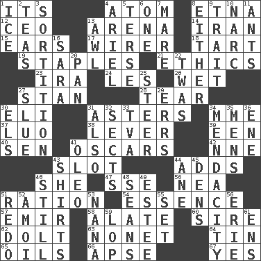 ACROSS 1. It is 4. Tiny particle 8. Inactive volcano in Sicily 12. Corporate head (abbr.) 13. Sports stadium 14. SW Asia republic 15. Hearing organs 17. One who wires 18. Small pie 19. Paper fasteners 21. Value system 23. Lyricist Gershwin 24. French article 26. Soggy 27. Comedian Laurel of Laurel & Hardy 28. Separate forcefully 30. Connecticut Ivy Leaguer 31. Michaelmas daisies 34. Madame (abbr.) 37. Nilotic language 38. Prying instrument 39. Car or cant ending 40. Elected rep. 41. Motion picture awards 42. Compass dir. 43. Narrow opening 44. Does sums 46. A female animal or person 47. Compass dir. 50. Teachers' org. 51. Food allowance for one day 54. Core 57. Independent ruler or chieftain 58. Having winglike extensions 60. Beget 62. Stupid person 63. Music written for nine 64. Shallow baking pan 65. Lubricates 66. Domed church section 67. Consenting reply DOWN 1. Frozen water 2. Afternoon social gatherings 3. Casting lots 4. Satellite of Uranus 5. Laconic 6. Single 7. Female horse 8. One or the other 9. Distinguishing feature 10. Drug cop 11. Pismires 13. Leather borer 16. "Two Mules for Sister ____" 20. Baking dish 22. It was, poetically 25. Guide 27. Change direction abruptly 29. Blunders 30. Raised railways 31. In addition 32. Religious groups 33. Federal power corp. 34. Ananias' fault 35. Not women's 36. Compass dir. 41. Butter sub 43. Upper-body garments 44. One (Scot) 45. Habitations of wild animals 46. Not moving 48. Seines 49. First name in cosmetics 51. Do over again 52. Mine, in Marseilles 53. Grandmother 55. Put into a specified state 56. One of the Great Lakes 59. Trim (branches) 61. Followers of ems