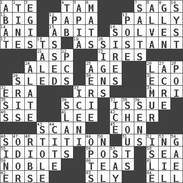 ACROSS 1. Had dinner 4. Scottish cap 7. Droops 11. Of large size 12. Dad 13. Friendly 14. Black tropical American cuckoo 15. "This won't hurt ____!" 16. Finds the solution 17. Trials 19. Helper 21. Viper 23. Angers 24. Actor Baldwin 25. Personal question 26. Infant locale 29. Bobsleighs 30. Followers of ems 31. Environmental prefix 32. Epoch 33. Big collection agency 34. Medical imaging device (abbr.) 35. Be seated 36. _-fi 37. Come out of 40. Compass dir. 41. Area sheltered from the wind 42. "Mermaids" star 43. Examine minutely or intensely 45. Period of immesurable duration 46. Conclusion 51. Putting into practice 55. Foolish or stupid persons 56. Mail 58. Ocean 59. Having high moral qualities 60. Beverages made from leaves 61. Untruth 62. Celtic language 63. Cunning 64. Pipe bend DOWN 1. Blind as ____ 2. Prong on a fork 3. Armor plate that protects the chest 4. Bar bill 5. Capital of Western Samoa 6. Floor coverings 7. Table seasonings 8. Inventor's middle name 9. Small, secluded valley 10. System (abbr.) 12. Went by 13. Airs 16. Begets 18. Falsehood 20. Attaches a signature 22. Personal Computers (abbr.) 24. Having winglike extensions 25. Nest on high 26. Arboreal primate 27. Land measure 28. Luau course 29. Indian titles of respect 32. Double-curved letter 33. Ancient Celtic tribe of eastern Britain 36. Narrow boards 37. Frozen water 38. Yells 39. Elected reps. 43. Took without asking 44. Quote 46. Trig term 47. Scent 48. Teases 49. Chooses 50. Christmas carol 52. Small island 53. Famous astronaut Armstrong 54. Highlander 57. Declare