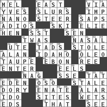ACROSS 1. Cartoonist voice _ Blanc 4. 90 degrees 8. By way of 11. Jacques Cousteau's middle name 13. Runs notes together 15. Naughty child 16. Billionth: prefix 17. Guide 18. Plant excrements 19. Goodbye (Sp.) 21. What Jean-Claude Killy likes to do 22. Writer Wiesel 23. Layer 24. Fast jet (abbr.) 27. Elected rep. 29. It was, poetically 30. Rhinal 34. Shoshoni 36. Small amounts or degrees 39. Took without asking 40. Actor Alda or Thicke 41. Potato state 43. Margarine 44. Grayish beige 46. Inky black, to poets 47. To separate or throw off 48. Keyboard key 49. Snakelike fish 51. Tired old horse 53. Compass dir. 54. Make lace 57. Paradise 60. Bear (Spanish) 63. Lacking originality or spontaneity 65. Dinghy 66. Related on the mother's side 69. Having or resembling wings 70. Wedding promise 71. Settings 72. Soaks 73. Begley and Asner 74. Not this but _ 75. Observe DOWN 1. Non-adult bird? 2. Dodge 3. Soviet premier 1918-24 4. Curvy letter 5. Keyboard modifier key 6. Institutes legal proceedings 7. Long journey 8. Small bottle 9. Body of Kaffir warriors 10. Domed church section 12. "Barney Miller" actor Jack 14. Indian titles of respect 18. Elected representatives 20. Compass dir. 25. Suttee (variant) 26. Sadhe (variant) 28. Followers of ems 29. 3-inch nail 31. Not divided or shared with others 32. Toward shelter 33. Lion 34. ____ Bator 35. Drawn tight 37. Pat or tap gently 38. Imelda's hoard 40. Had dinner 42. Singles 45. Period 50. French article 52. Leaves 54. Falsehoods 55. Having winglike extensions 56. Laconic 57. Singer Brickell 58. Texas town _ City 59. Greek god of love 61. In a ____ (agitated or irritated) 62. Pledge 64. The 23rd letter of the Hebrew alphabet 67. Afternoon social gathering 68. Eastern Standard Time (abbr.)