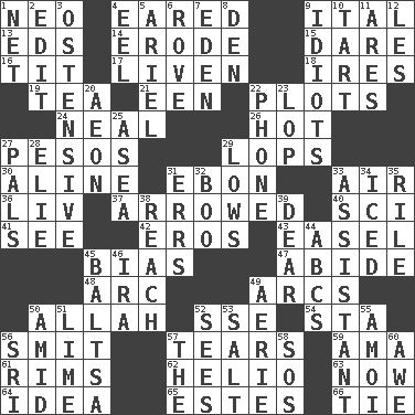 ACROSS 1. Modern: prefix 4. Having ears or earlike features 9. Slanted text style (abbr.) 13. Begley and Asner 14. Wear away 15. Have the gumption 16. Teat (slang) 17. Make or become more lively 18. Angers 19. Afternoon social gathering 21. Car or cant ending 22. Schemes 24. Be tempered by heat 26. Being at a high temperature 27. Mexican monetary units 29. Chops off 30. Place in a line 31. Inky black, to poets 33. Wind 36. 54 in ancient Rome 37. Moved like an arrow 40. _-fi 41. Perceive with the eye 42. Greek god of love 43. Artist's stand 45. Prejudice 47. Remain 48. Curve 49. Curves 50. Assad's deity 52. Compass dir. 54. R.R. building 56. Stricken, poetically 57. Separates forcefully 59. Wet nurse (var.) 61. Basketball hoops 62. Sun: prefix 63. At this time 64. It may be bright or harebrained 65. _____ Park, CO 66. Standoff DOWN 1. Fish or hair follower 2. Prepare for publication 3. Clearly or manifestly demonstrative 4. Snakelike fish 5. Satellite of Uranus 6. Be footloose 7. Paradise 8. Lair 9. Foolish or stupid persons 10. Small pie 11. Ancient Greek god of war 12. French article 20. A really long time 22. Give a jingle 23. Chop off 25. Toward the sea 27. Friends 28. Writer Wiesel 29. Moos 31. Blunders 32. Sometimes accompanies a hiss 33. Helper 34. On the rocks 35. Cause heat under the collar 38. Arrive at 39. Letter starter 44. Lettered men learn these first 45. Greek mezzo-soprano Agnes 46. Retirement account (abbr.) 49. Nest on high 50. Among 51. Citrus frut 52. Observes 53. Table seasoning 55. Mine, in Marseilles 56. Indian title of respect (Mr.) 57. Definite Article 58. Mayday 60. Deep reverence