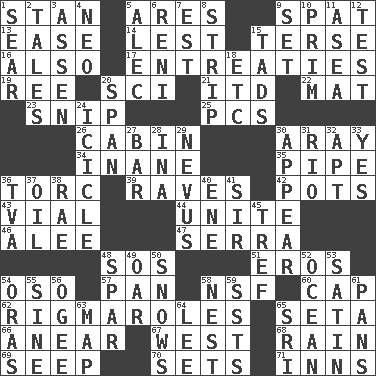 ACROSS 1. Comedian Laurel of Laurel & Hardy 5. Ancient Greek god of war 9. Petty quarrel 13. Comfort 14. For fear that 15. Laconic 16. In addition 17. Pleas 19. Portuguese money of account (variant) 20. _-fi 21. It would 22. Floor protector 23. Sever or remove by pinching or nipping 25. Personal Computers (abbr.) 26. Apartment or room in a ship 30. Like ___ of sunshine 34. Empty; void 35. Corncob 36. Torque (variant) 39. All-night dance parties 42. Cooking vessels 43. Small bottle 44. Join together 46. Toward shelter 47. Spanish missionary in California 48. Mayday 51. Greek god of love 54. Bear (Spanish) 57. Baking dish 58. Science/research agcy. 60. Head covering 62. Frustrating wastes of time 65. Bristle 66. Approach 67. Compass direction 68. Precipitation 69. Ooze 70. Puts into a specified state 71. Restaurants DOWN 1. Shrivel 2. Stories 3. NE Netherlands city 4. Modern: prefix 5. Actor Baldwin 6. Painter Guido (1575-1642) 7. Eastern Standard Time (abbr.) 8. Long narrow piece of something 9. Arrange properly for use 10. Demure 11. At sea 12. Trial 15. Bits 18. And so on (abbr.) 20. Connect, as a bridge 24. Ice on the eave 27. Soap unit 28. _ tizzy (2 wds.) 29. Mole, birthmark 30. Become visible 31. _ de Janeiro 32. Fitting 33. It is so 36. Federal power corp. 37. Petroleum 38. Actress Charlotte 40. Compass dir. 41. Title for a knight 45. Not kosher 48. Practice fight 49. Rowing implement 50. Overwhelms 52. Sea 53. Smooth fabric 54. Mouths or openings 55. Trig term 56. Double curve, resembling the letter S 58. A home for chicks 59. Fast planes 61. Zero-star reviews 63. Atlas unit 64. Area sheltered from the wind 65. _ Lanka