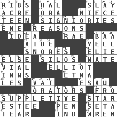 ACROSS 1. Chest bones 5. Actor Linden 8. Kill 12. 43,560 square feet 13. Mouth or opening 14. Sibling's daughter 15. Adolescent 16. Seigniories (variant) 19. Compass dir. 20. Thinks logically 21. The main thing one is thinking about 23. Actress Charlotte 24. Sound made by sheep 27. Assistant 30. Shout 31. Sounds asleep 34. Writer Wiesel 35. Otherwise 38. Grain storage towers 40. Nathan's nickname 41. Small bottle 42. American author Paul (1891-1958) 44. Restaurants 45. Inactive volcano in Sicily 46. French article 47. Large container 50. Son of Isaac 53. Speakers 57. From 59. Supplementary 63. Play the lead 64. First name in cosmetics 65. Animal enclosure 66. Stalk of a moss capsule 67. Rend 68. Indiana (abbr.) 69. Songbird DOWN 1. Pace 2. Ancient Celtic tribe of eastern Britain 3. A special lineage 4. Elected rep. 5. Flexible conduit 6. Operatic vocal solo 7. Straggles 8. Title for a knight 9. Flowery wreath 10. Adept person 11. It is so 14. Characteristic smell of wine 17. And not 18. _ tizzy (2 wds.) 20. Precipitation 22. Artist's stands 24. Actor Lugosi 25. Set down 26. Toward shelter 28. Two (Sp.) 29. One of the Great Lakes 30. Gossips 32. Pipe bend 33. Not divided or shared with others 35. Morally bad or wrong 36. Actor's bit 37. Without 39. Be seated 43. Singles 47. Grand slam 48. "We ___ not amused" (Victoria) 49. Make lace 51. Following 52. A salt of uric acid 54. Native american tent (variation) 55. Baking chamber 56. Tear apart 58. NW Algerian seaport 59. Arrange properly for use 60. Purpose 61. Parent Teacher Association (abbr.) 62. For each 63. Compass dir.
