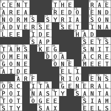 ACROSS 1. Penny 5. Definite Article 8. Actress Charlotte 11. Type of rug 12. Redecorate 14. Conclusion 15. Typical standards 17. Damascus' land 18. Manchild 19. Contrary to your interests or welfare 21. Arrange properly for use 22. _ tizzy (2 wds.) 23. Area sheltered from the wind 24. Binary compound 25. Possessed 27. Plant excrement 28. Puts into a specified state 31. Scottish caps 35. Cask 37. In a ____ (agitated or irritated) 38. Presage 39. ___ good deed 41. Land measure 42. Went 43. Single 45. Confront 46. Assistant 47. Connecticut Ivy Leaguer 49. Sandy's bark 51. River (Sp.) 52. Followers of ems 55. The grampus (Milton) 57. Call ___ day 60. Commissioned military rank 62. Luau course 63. Difficult 65. Before Barbara or Clara 66. Small child 67. Double curve, resembling the letter S 68. Thailand, formerly 69. Filthy place 70. Saxophone 71. Snakelike fish DOWN 1. Lessep's creation 2. Wear away 3. Boldness 4. Not wild 5. Attempt to accomplish something 6. Possessive pronoun 7. Singer Brickell 8. Dwelling 9. At once, immediately (arch.) 10. Pulitzer Prize-winning author Ferber 13. Pledge 16. Indian titles of respect 17. Oozed 20. Neighbor of Neb. 26. Indian state 29. Become fatigued 30. Proofreading order 31. Ancient Roman robe 32. Mine, in Marseilles 33. Ananias' fault 34. Scornful expression 36. Thick or sticky substance 40. Disorder of the immune system 44. Writer Wiesel 48. Charged particles 50. Fine (Spanish) 52. Bert's buddy 53. Relating to or accompanying birth 54. Hits or strikes with great force 55. Chooses 56. Carrot, for example 58. Labels 59. Toward the sea 61. Relaxation 64. John Ritter's dad