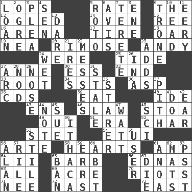ACROSS 1. Chops off 5. Assign a rank or rating to 9. Definite Article 12. Stared at amorously 14. Baking chamber 15. To separate or throw off 16. Sports stadium 17. Become fatigued 18. Boat paddle 19. Teachers' org. 20. Full of chinks, cracks, or crevices 23. "60 Minutes" Commentator Rooney 24. Past tense of be (plural) 25. Periodic rise and fall of the sea level 27. Singer Murray 30. Double-curved letter 32. Conclusion 33. Carrot, for example 34. Fast planes 36. Cleo's killer 38. Music discs 39. Consume 40. Binary compound 43. Followers of ems 46. Cole _ (cabbage dish) 48. Portico 49. Fr. "Yes" 51. Period 52. Burn to charcoal 53. Proofreading order 54. Needle holder 56. Johnson of "Laugh-In" 58. Centers of feelings and intuitions 61. Electrical Unit 64. Cards in a Roman deck? 65. Sharp remark 66. Ferber et al. 68. 100% 69. 43,560 square feet 70. Disturbances 71. Born 72. Political cartoonist Thomas 73. 90 degrees DOWN 1. Grant temporary use of 2. Legendary monster 3. Entreaty 4. Elected rep. 5. Printing process, for short 6. Opinion 7. Cylindrical with tapered ends 8. Compass dir. 9. Marketplace scale 10. Froth on beer 11. Suggestive of the supernatural 13. Have the gumption 21. Angers 22. Makes clutter 23. Sums up 24. Dripping 26. _ tizzy (2 wds.) 27. Curve 28. Dreamland 29. Olfactory organ 31. Having lost freshness 35. A viewer who gazes fixedly 37. Essential or central part 41. ___ good deed 42. Ewer handle 44. Make mention of 45. Take to court 47. Electrical Unit 48. _-fi 50. New York city 53. Vertical member of a panel or frame 55. One who uses or employs something 56. ____ Jay Lerner 57. Cause heat under the collar 59. Blunders 60. Collude with 61. Small Philippine buffalo 62. Floor coverings 63. Inconspicuous attention getter 65. Forbid 67. Pass on