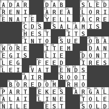 ACROSS 1. The sixth month of the Jewish calendar 5. Small moist lump or mass 8. Downhill vehicle 12. Painter Guido (1575-1642) 13. Type of rug 15. Australian parrot (variant) 16. Related on the mother's side 18. Shout 19. 1/640 square mile 20. Music discs 22. Deli grouping 24. Command 26. ___ a Wonderful Life 27. To the inside or interior of 28. Institute legal proceedings 29. Chief or king in Benin or Nigeria 32. Had on 35. A distinct part 37. Daniel's nick name 38. The front part of a cuirass 39. Falsehood 40. Do not 41. Part of a journey 42. Nourish 43. Angers 44. Luau accessory 45. Large container 46. Conclusions 49. Wind 50. Carrot, for example 51. Mood resulting from idleness 55. 17th letter of the Greek alphabet 56. Component 57. Supplements with great effort 59. Therefore, facetiously 63. Jai ____ 64. Actor's bit 65. Lacquered or enameled metalware 66. "Death on the ____" 67. Eastern Standard Time (abbr.) 68. Disposed of to a purchaser DOWN 1. "We ___ not amused" (Victoria) 2. Lair 3. Santa ___, CA 4. Actors Guy, Robert Welles, and Clint 5. 24 hours 6. Ancient Greek god of war 7. Actor Lugosi 8. Criticizes harshly 9. Event scenes 10. Blunders 11. Pass on 14. Plant genus of onion and garlic 17. Paradise 21. Fast jet (abbr.) 23. Had dinner 25. Rest room 28. Sowing specialist 29. Scent 30. Object of repulsion 31. Pismires 32. Not ill 33. Double curve, resembling the letter S 34. Swiss mountan, "Queen of the Mountains" 36. Neckwear 40. What propaganda does 42. Bundle 45. Compete 47. And not 48. Capital of the state of Qatar 49. Nick name for Arthur 51. Indonesian resort city 52. Spoken 53. Migrant worker of the '30s 54. Not women's 56. Baking dish 58. Arrange properly for use 60. Thick or sticky substance 61. 100% 62. Directed