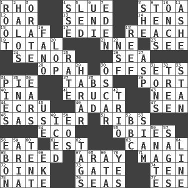 ACROSS 1. 17th letter of the Greek alphabet 4. Turn sharply 8. Portico 12. Boat paddle 13. Transmit 14. Coop moms 15. Norwegian king 17. Singer Brickell 18. Arrive at 19. Add up to 21. Compass dir. 23. Observe 24. Sir (Sp.) 26. Ocean 28. Brightly colored fish 30. Cancels 34. Sliced dessert 37. Bar bills 39. Left side of a ship or aircraft 40. _ tizzy (2 wds.) 41. Spew [out] 43. Teachers' org. 44. Shade of tan 46. The sixth month of the Jewish calendar 47. Elected rep. 48. More impudent 51. Chest bones 54. Environmental prefix 55. Off-Broadway awards 58. Erode 61. Eastern Standard Time (abbr.) 63. Lessep's creation 65. A special lineage 67. Like ___ of sunshine 71. Wise men 72. Pig sound 73. Yard entry 74. "___ Little Indians" 75. Nathan's nickname 76. Oceans 77. Compass dir. DOWN 1. Carrot, for example 2. Rings 3. Speak pompously 4. Compass dir. 5. Directed 6. Corn or form start 7. Paradise 8. A female animal or person 9. Afternoon social gatherings 10. Single time 11. American tennis player Robert 16. Papal veil 18. Coral ridge 20. Chop off 22. Science/research agcy. 25. Pace 27. Cleo's killer 29. Ethiopian city, capital of Harari 30. Witty Wilde 31. Immeasurably long periods of time 32. Family _ (genealogy) 33. Comedian Laurel of Laurel & Hardy 34. Sliced desserts 35. South American Indian 36. Hearing organs 38. Partially opened flower 42. Musical group of three 45. Purpose 49. On the rocks 50. Greek goddess of the dawn 52. English channel? 53. Thailand, formerly 56. Related on the mother's side 57. Gurus 58. Inky black, to poets 59. Roberta Peters solo 60. Portable shelter 62. Labels 64. Actor's bit 66. Supplement with great effort 68. Actress Charlotte 69. _ moment's notice (2 wds.) 70. It is so
