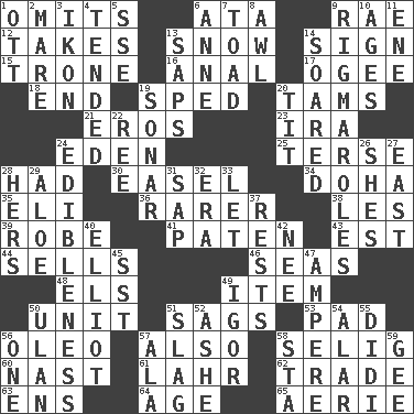 ACROSS 1. Leaves out 6. _ moment's notice (2 wds.) 9. Actress Charlotte 12. Receives possession of 13. Frozen precipitation 14. Omen 15. Marketplace scale 16. Of or related to the anus 17. Double curve, resembling the letter S 18. Conclusion 19. Drove too fast 20. Scottish caps 21. Greek god of love 23. Lyricist Gershwin 24. Genesis locale 25. Laconic 28. Possessed 30. Artist's stand 34. Capital of the state of Qatar 35. Connecticut Ivy Leaguer 36. More uncommon 38. French article 39. Loose flowing garment 41. Eucharist need 43. Eastern Standard Time (abbr.) 44. Exchanges for money 46. Oceans 48. Raised railways 49. A whole individual unit 50. A single undivided whole 51. Droops 53. Writing tablet 56. Butter sub 57. In addition 58. Major League Baseball Commissioner Bud 60. Political cartoonist Thomas 61. Cowardly lion portrayer 62. Exchange 63. Followers of ems 64. Ripen 65. Nest on high DOWN 1. Baseball player Mel 2. Female horse 3. Picture 4. Watched over 5. Compass dir. 6. Queen of England 1702-14 7. Frog relative 8. Leather borer 9. Complicated, petty procedures 10. Grows older 11. Compass dir. 13. Plant excrements 14. Flew 19. Underwater navigation system 20. Teat (slang) 22. Portuguese money of account (variant) 24. The property of being fit to eat 26. "______ My Girl" (Turtles hit) 27. 90 degrees 28. Possessive pronoun 29. _ vera 31. Plant excrement 32. Period 33. Allow 37. Musical pauses 40. American author Paul (1891-1958) 42. Born 45. Fast jet (abbr.) 47. Electrical Unit 49. Russian composer Stravinsky 50. ____ Bator 51. Volcanic refuse 52. American tennis player Robert 54. Having or resembling wings 55. "You Light Up My Life" star Conn 56. Single 57. Chicken ___ king 58. R.R. building 59. Turn to the right