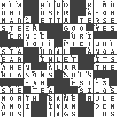 ACROSS 1. ___ Haven, CT 4. Tear apart 8. Western Nevada city 12. Corn or form start 13. One who makes use of a thing 14. Period of immesurable duration 15. Drug cop 17. Singer James 18. Laconic 19. Navigate 21. Thick or sticky substance 23. It is so 24. Bert's buddy 26. RI univ. 28. Carryall 30. Photo 34. R.R. building 37. Hereditary estate 39. Small Philippine buffalo 40. Ewer handle 41. An arm off of a larger body of water 43. ___ a Wonderful Life 44. So be it 46. Having or resembling wings 47. Definite Article 48. Thinks logically 51. Institutes legal proceedings 54. Air blower 55. _____ Park, CO 58. A female animal or person 61. Beverage made from leaves 63. Grain storage towers 65. Compass direction 67. Object of repulsion 71. General guideline 72. Mine, in Marseilles 73. _ the terrible 74. Lair 75. Airs 76. Labels 77. Begley and Asner DOWN 1. Religious women 2. Maternal 3. One who wires 4. Regret 5. Eastern Standard Time (abbr.) 6. Fish or hair follower 7. To draw with force 8. Actress Charlotte 9. Suggestive of the supernatural 10. Olfactory organ 11. Washington bills 16. Penny 18. Torque (variant) 20. _ de Janeiro 22. Fr. "Yes" 25. Needle holder 27. Call ___ day 29. Ferber et al. 30. Entreaties 31. A single undivided whole 32. Writer of Portnoy's Complaint (1969) 33. Relaxation 34. Shrivel 35. Docile 36. Type of rug 38. 100% 42. Loyal 45. Overdraft (abbr.) 49. Pledge 50. Compass dir. 52. Double-curved letter 53. Agitate 56. Evade 57. Having a sole or soles 58. Fastener 59. Like (prefix) 60. Greek god of love 62. "This won't hurt ____!" 64. Elected reps. 66. Neckwear 68. Actress Gardner 69. Tired old horse 70. Followers of ems