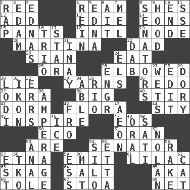 ACROSS 1. To sift 4. 480, 500 or 516 sheets of paper 8. "______ My Girl" (Turtles hit) 12. Say or write further 13. Singer Brickell 14. Immeasurably long periods of time 15. Leg coverings 18. International (abbr.) 19. Connecting point 20. Chrissie's court nemesis 22. June honoree 23. Thailand, formerly 24. Consume 25. Mouth or opening 26. Shoved, as through a crowd 30. Untruth 33. Tall tales 36. Make new 37. Gumbo ingredient 39. Large 40. Disorderly outburst 41. Dormintory (informal) 42. Plants 44. Filthy place 45. Heighten or intensify 47. Greek goddess of the dawn 50. Environmental prefix 51. NW Algerian seaport 53. "We ___ not amused" (Victoria) 54. Elected representative 57. Inactive volcano in Sicily 59. Send forth 61. Pale purple color 63. Heroin 64. Table seasoning 65. Alias (abbr.) 66. Lacquered or enameled metalware 67. Portico 68. Fish or hair follower DOWN 1. Hit sharply and swiftly 2. Dutch treat 3. Ferber et al. 4. It's straight from the horse's mouth 5. Pulitzer Prize-winning author Ferber 6. Small island 7. Cartoonist voice _ Blanc 8. Elected representatives 9. Parka part 10. Conclude 11. Compass dir. 16. Musical group of three 17. Play the lead 21. "If ____ say so..." 22. Small moist lump or mass 24. Raised railways 26. Engineer (abbr.) 27. Soaks 28. Prepare for publication 29. Small, narrow, flatbottom fishing boat 30. Farming town in central California 31. Picture 32. Blunders 34. Competent 35. River (Sp.) 38. Electrical Measurement 42. From 43. A really long time 46. Frozen water 48. Taken by mouth 49. Suttee (variant) 52. Pitcher Ryan 53. Of or related to the anus 54. Grain storage tower 55. Singer James 56. Libertine 57. Eastern Standard Time (abbr.) 58. Ring climax 59. Curvy letter 60. Floor covering 62. Domesticated feline