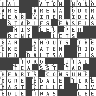 ACROSS 1. Actor Linden 4. Smallest unit of an element 8. Words to Nanette 12. "We ___ not amused" (Victoria) 13. Sports stadium 14. Aroma 15. Letter starter 17. One who wires 18. The main thing one is thinking about 19. Paper fasteners 21. Artist's stands 23. Part of HMS, perhaps 24. Part of a journey 26. For each 27. Painter Guido (1575-1642) 28. Allows 30. Slender fish 31. Yells 34. Definite Article 37. Supplement with great effort 38. Ingested 39. To free from 40. Directed 41. Greek mezzo-soprano Agnes 42. Raised railways 43. "Corrida" creature 44. Slanted text style (abbr.) 46. Beverage made from leaves 47. Fast jet (abbr.) 50. Small amount or degree 51. Centers of feelings and intuitions 54. Ingest 57. Legendary monster 58. Peak District village in England 60. Hoop that covers a wheel 62. Vertical spar for supporting sails 63. Cell (Danish) 64. 54 in ancient Rome 65. Singer Brickell 66. It was, poetically 67. Area sheltered from the wind DOWN 1. Possessed 2. Ancient Greek god of war 3. Tough but pliablecoriaceous 4. Satellite of Uranus 5. Laconic 6. Single 7. Female horse 8. Annoying sounds 9. More peculiar 10. Christmas carol 11. Mouths or openings 13. Leather borer 16. Water falling in drops from the sky 20. 23rd letter of the Greek alphabet 22. Flats, for short 25. Cements 27. Libertine 29. Inactive volcano in Sicily 30. Set 31. Singe 32. Saint headwear 33. Baseball player Mel 34. Excercise machine 35. Land elevation 36. Begley and Asner 41. Water vessel 43. Cigar-shaped 44. ___ a Wonderful Life 45. Tense 46. Tarsus (plural) 48. Any of the three canals of the cochlea 49. For Whom the Bell _____ 51. Dwelling 52. Mild oath 53. Religious group 55. Born 56. 4th largest of the Great Lakes 59. Morning condensation 61. Night before a holiday