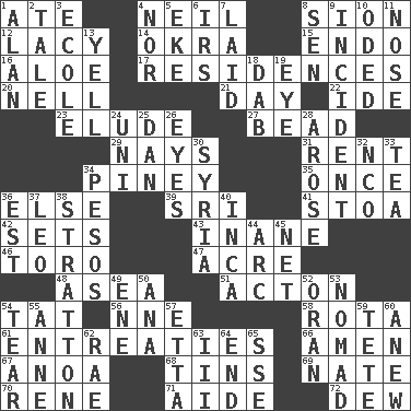 ACROSS 1. Had dinner 4. Famous astronaut Armstrong 8. The Jewish people; Israel 12. Made of lace 14. Gumbo ingredient 15. Inside; within (prefix) 16. Medicinal plant 17. Dwellings 20. 1994 drama film starring Jodie Foster 21. 24 hours 22. Binary compound 23. Evade 27. Necklace unit 29. Negative votes 31. Monthly bill 34. Abounding in pines 35. At one time in the past 36. Otherwise 39. _ Lanka 41. Portico 42. Puts into a specified state 43. Empty; void 46. "Corrida" creature 47. Land measure 48. Toward the sea 51. NE Massachussets city 54. Make lace 56. Compass dir. 58. Round or rotation of duties 61. Pleas 66. So be it 67. Small Philippine buffalo 68. Metal containers 69. Nathan's nickname 70. French philosopher Descartes 71. Assistant 72. Morning condensation DOWN 1. Actor Alda or Thicke 2. Falsehood 3. Learning spot: Fr. 4. Not either 5. Supplement with great effort 6. Big collection agency 7. Put down 8. Elected rep. 9. Event 10. Wrote a lyric poem 11. Sense of smell 13. Shout 18. Pat or tap gently 19. Sight organ 24. Single; one (prefix) 25. One of the 12 tribes of Israel 26. Sight organs 28. Came up 30. Damascus' land 32. Non-commissioned officer (abbr.) 33. Afternoon social gathering 34. Mexican monetary units 36. Eastern Standard Time (abbr.) 37. Lion 38. Ski resort town in Vermont 40. South American Indian 44. Curve 45. Fish or hair follower 49. Compass dir. 50. Santa ___, CA 52. NW Algerian seaport 53. Wanderer 54. Pull into pieces 55. Singer Murray 57. Singer James 59. Wig 60. Afresh 62. Actress Charlotte 63. One more than two 64. Conclusion 65. Compass dir.