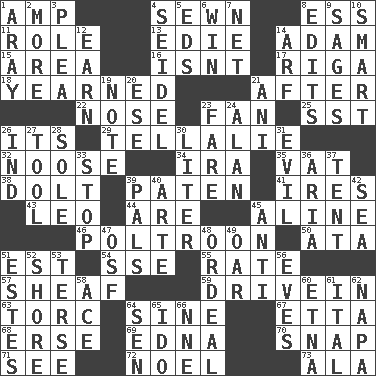 ACROSS 1. Electrical Unit 4. Stitched 8. Curvy letter 11. Hero or heavy, e.g. 13. Singer Brickell 14. First of billions? 15. Length times width 16. Is not 17. Port city in Latvia 18. Had a strong desire 21. Following 22. Olfactory organ 23. Air blower 25. Fast jet (abbr.) 26. ___ a Wonderful Life 29. Copy Pinocchio 32. Trap for birds or small mammals 34. Lyricist Gershwin 35. Large container 38. Dunce 39. Eucharist need 41. Angers 43. Lion 44. "We ___ not amused" (Victoria) 45. Place in a line 46. Characterized by complete cowardliness 50. _ moment's notice (2 wds.) 51. Eastern Standard Time (abbr.) 54. Compass dir. 55. Pace 57. To gather and bind into a bundle 59. Popular '50s hangout 63. Torque (variant) 64. Trig term 67. Singer James 68. Celtic language 69. Pulitzer Prize-winning author Ferber 70. Fastener 71. Observe 72. Christmas carol 73. Chicken ___ king DOWN 1. Like ___ of sunshine 2. Greater amount 3. Entreaty 4. Beer mug 5. Begley and Asner 6. Acquire through effort 7. Remaining after all deductions 8. Proofreads 9. Gurus 10. Don Adams' spy role 12. Merit 14. Sandy's bark 19. Brief written record 20. Compass dir. 21. Cuckoo 23. Conductor's collection 24. Actor Alda or Thicke 26. Indiana (abbr.) 27. Implement 28. Not divided or shared with others 30. 61 cubic inches 31. Morally bad or wrong 33. Cease 36. Roberta Peters solo 37. Portable shelter 39. Friends 40. Johnson of "Laugh-In" 42. Ocean 45. Against 47. Order of Saint Francis (abbr.) 48. Severe or trying experience 49. Boat paddle 51. _____ Park, CO 52. Dinah or Pauly 53. Laconic 56. Nights before holidays 58. Adept person 60. Inactive volcano in Sicily 61. Slanted text style (abbr.) 62. California wine valley 64. Elected rep. 65. Wedding promise 66. Compass dir.