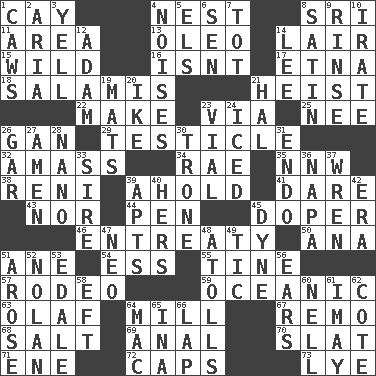ACROSS 1. Island 4. A home for chicks 8. Indian title of respect (Mr.) 11. Type of rug 13. Butter sub 14. Den 15. Uncontrolled 16. Is not 17. Inactive volcano in Sicily 18. Deli grouping 21. Robbery 22. Create 23. By way of 25. Born 26. Separate the seeds from cotton 29. A testis 32. Collect or gather 34. Actress Charlotte 35. Compass dir. 38. Painter Guido (1575-1642) 39. Hold, grip (Informal) 41. Have the gumption 43. And not 44. Writing instrument 45. Drug addict 46. Plea 50. Santa ___, CA 51. One (Scot) 54. Double-curved letter 55. Prong on a fork 57. Cowboy competition 59. Pertaining to the sea 63. Norwegian king 64. Place where flour is made 67. San ____ (Riviera town) 68. Table seasoning 69. Of or related to the anus 70. Narrow board 71. Compass dir. 72. Balmoral and tarboosh 73. Sodium hydroxide DOWN 1. Crow sounds 2. Operatic vocal solo 3. Shout 4. Annoying sounds 5. Raised railways 6. Elected rep. 7. Small child 8. Smooth fabric 9. Remove soap 10. Feeling or showing extreme anger 12. First man 14. Area sheltered from the wind 19. Floor coverings 20. Mamie's mate 21. Actor Linden 23. Small bottle 24. On the rocks 26. Slender fish 27. So be it 28. Billionth: prefix 30. Marketplace scale 31. Inside; within (prefix) 33. Male parent of an animal 36. California wine valley 37. Songbird 39. Flats, for short 40. Possessive pronoun 42. Epoch 45. Unit of force 47. Modern: prefix 48. Ringlike coral islands and reefs 49. Nervous spasm 51. Came up 52. Pitcher Ryan 53. Peak District village in England 56. Hearing organs 58. Bank Draft (abbr.) 60. 1994 drama film starring Jodie Foster 61. "If ____ say so..." 62. ____ d'Azur (French Riviera) 64. Apple computer (short form) 65. _ tizzy (2 wds.) 66. Infant locale