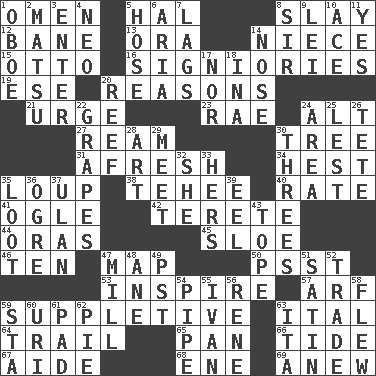 ACROSS 1. Sign of something about to happen 5. Actor Linden 8. Kill 12. Object of repulsion 13. Mouth or opening 14. Sibling's daughter 15. Von Bismarck 16. Seigniories (variant) 19. Compass dir. 20. Thinks logically 21. Goad 23. Actress Charlotte 24. Keyboard modifier key 27. 480, 500 or 516 sheets of paper 30. Family _ (genealogy) 31. Anew 34. Behest 35. Central Nebraska county 38. Giggle 40. Pace 41. Stare 42. Cigar-shaped 44. Mouths or openings 45. _ gin 46. Nine, plus one 47. Atlas unit 50. Inconspicuous attention getter 53. Motivate 57. Sandy's bark 59. Supplying deficiencies 63. Slanted text style (abbr.) 64. Get behind 65. Baking dish 66. Event that recurs at intervals 67. Assistant 68. Compass dir. 69. Afresh DOWN 1. Mitch Miller's instrument 2. Taiwanese island in East China Sea 3. Keyboard key 4. Modern: prefix 5. Flexible conduit 6. Roberta Peters solo 7. Falls behind 8. Title for a knight 9. Luau accessory 10. Adept person 11. It is so 14. Olfactory organ 17. Not either 18. _ tizzy (2 wds.) 20. Coral collection 22. Raisin fruits 24. Length times width 25. For fear that 26. Wig 28. Tate display 29. Confront 30. Triads 32. A female animal or person 33. Possessive pronoun 35. Plunder 36. Legendary monster 37. Uhlan (variant) 39. Snakelike fish 43. Drink excessively 47. Place where flour is made 48. One (Scot) 49. Pacific Standard Time (abbr.) 51. Smooth fabric 52. Buy and sell 54. Corncob 55. "Terrible" tsar 56. French philosopher Descartes 58. Soared 59. R.R. building 60. RI univ. 61. Groovy apt. 62. Sliced dessert 63. Call ___ day