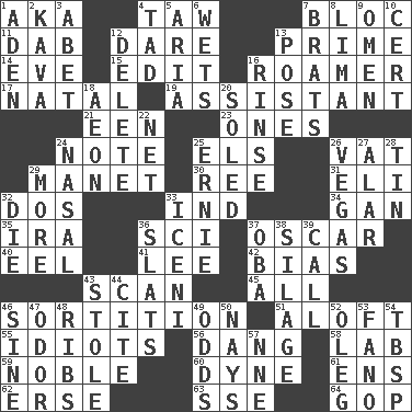 ACROSS 1. Alias (abbr.) 4. The 23rd letter of the Hebrew alphabet 7. Coalition 11. Pat or tap gently 12. Have the gumption 13. A-one 14. Night before a holiday 15. Prepare for publication 16. Nomad 17. Relating to or accompanying birth 19. Aide 21. Car or cant ending 23. Washington bills 24. Short letter 25. Raised railways 26. Large container 29. French painter Edouard 30. Portuguese money of account (variant) 31. Biblical high priest 32. Two (Sp.) 33. Indiana (abbr.) 34. Separate the seeds from cotton 35. Retirement account (abbr.) 36. _-fi 37. Motion picture award 40. Snakelike fish 41. Area sheltered from the wind 42. Prejudice 43. Examine minutely or intensely 45. Everything 46. Decision 51. Upward 55. Foolish or stupid persons 56. Mild oath, euphamism for damn 58. Experiment locale 59. Impressive in appearance 60. Centimeter-gram-second unit of force 61. Followers of ems 62. Celtic language 63. Compass dir. 64. Grand Old Party DOWN 1. An important port of Yemen 2. Polynesian shrub of the pepper family 3. Collude with 4. Small boy 5. Roberta Peters solo 6. Soaks 7. Naughty children 8. Pale green bean 9. Presage 10. An absolute certainty 12. Keyboard key 13. Introduce or present, as a question 16. Wash lightly 18. Period of immesurable duration 20. Having a sole or soles 22. Remaining after all deductions 24. Rhinal 25. Bert's buddy 26. Viva Las _ 27. Having or resembling wings 28. Shallow baking pan 29. Greater amount 32. Pass on 33. Ancient Celtic tribe of eastern Britain 36. Narrow boards 37. Chief or king in Benin or Nigeria 38. Fodder prepared in a silo 39. Give a ring to 43. Fur scarf 44. Quote 46. Trig term 47. Aroma 48. Chest bones 49. Probability 50. Negative votes 52. Cassini of fashion 53. Papal veil 54. Cook's measure (abbr.) 57. Compass dir.