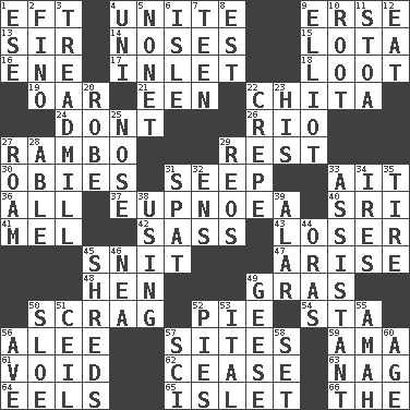 ACROSS 1. Lizard (obsolete) 4. Join together 9. Celtic language 13. Title for a knight 14. Olfactory organs 15. Globular water bottle used in Asia 16. Compass dir. 17. An arm off of a larger body of water 18. Plunder 19. Rowing implement 21. Car or cant ending 22. Riviera of "Kiss of the Spider Woman" 24. Do not 26. River (Sp.) 27. Role for Stallone 29. Remainder 30. Off-Broadway awards 31. Ooze 33. Small island 36. Everything 37. Normal relaxed breathing 40. _ Lanka 41. Cartoonist voice _ Blanc 42. Backtalk 43. Failure 45. In a ____ (agitated or irritated) 47. Ascend 48. Layer 49. Pate de foie ____ 50. Lean end of the neck 52. Sliced dessert 54. R.R. building 56. Toward shelter 57. Settings 59. Wet nurse (var.) 61. State of nonexistence 62. Stop 63. Tired old horse 64. Snakelike fish 65. Small island 66. Definite Article DOWN 1. Compass dir. 2. A pale, very dry sherry 3. Excercise machine 4. Corn or form start 5. Music written for nine 6. Small island 7. Adolescent 8. Eastern Standard Time (abbr.) 9. American author Paul (1891-1958) 10. Carrot, for example 11. Portico 12. Consume 20. Loose flowing garment 22. Streamer paper 23. Part of HMS, perhaps 25. Olfactory organ 27. Wander 28. Competent 29. Vintage cars 31. Petty quarrel 32. Followers of ems 33. Helper 34. Angers 35. Hoop that covers a wheel 38. Putting into practice 39. Having or resembling wings 44. Mouths or openings 45. Tears up 46. Teachers' org. 49. Honkers 50. _ gin 51. To provide with a ceiling 52. Sliced desserts 53. Slanted text style (abbr.) 55. Nursemaid 56. "___ Maria" 57. _-fi 58. Put into a specified state 60. Personal question