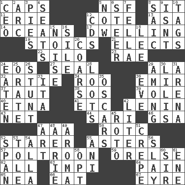 ACROSS 1. Balmoral and tarboosh 5. Science/research agcy. 8. Be seated 11. One of the Great Lakes 12. ____ d'Azur (French Riviera) 13. White ___ sheet 14. Seas 17. Residence 19. Unemotional ones 21. Chooses 22. Grain storage tower 23. Actress Charlotte 24. Greek goddess of the dawn 27. Lick closed 29. Chicken ___ king 32. Nick name for Arthur 34. Friend of Pooh 36. Arab leader 37. Pulled tight 38. Distress signal 39. Grand slam 40. Inactive volcano in Sicily 41. And so on (abbr.) 42. Soviet premier 1918-24 43. Fish or hair follower 44. Indian skirt 46. Girls' org. (abbr.) 47. American Automobile Association (abbr.) 50. College mil. group 52. A viewer who gazes fixedly 55. Michaelmas daisies 57. Coward 59. Threatening words 62. Everything 63. Body of Kaffir warriors 64. Ache 65. Teachers' org. 66. Ingest 67. Jane of fiction DOWN 1. Corporate head (abbr.) 2. Curve 3. Sliced desserts 4. Theater features 5. At this time 6. Guide 7. Man or boy (slang) 8. Ketch in the Levant 9. Is not 10. Labels 12. Music discs 15. Annoying sound 16. Drop; flow; fall 18. Area sheltered from the wind 20. Unrefined 24. Consumed 25. Declaim 26. Difficult or unusual or dangerous feat 28. Plunders 29. Amid 30. Ms. Damita and namesakes 31. Sports stadium 33. Call ___ day 35. Motion picture awards 36. Night before a holiday 42. 61 cubic inches 45. Printing process, for short 47. Nonscientific branch of learning 48. Nest on high 49. Scent 51. Streamer paper 52. Connect, as a bridge 53. Lacquered or enameled metalware 54. Silent film actress Nazimova 55. Black tropical American cuckoo 56. Kill 58. Elect 60. Title for a knight 61. Compass dir.