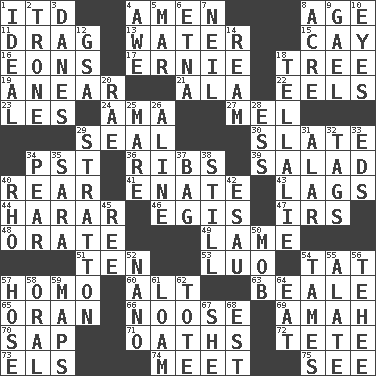 ACROSS 1. It would 4. So be it 8. Ripen 11. To draw with force 13. Wetness 15. Island 16. Immeasurably long periods of time 17. Bert's buddy 18. Relationship diagram 19. Approach 21. Insect wing 22. Snakelike fish 23. French article 24. Housemaid (var.) 27. Cartoonist voice _ Blanc 29. Lick closed 30. Chalkboard 34. Pacific Standard Time (abbr.) 36. Chest bones 39. Vegetable dish 40. Stern 41. Maternal 43. Fails to keep up a pace 44. Ethiopian city, capital of Harari 46. Armor plate that protects the chest 47. Big collection agency 48. Speak pompously 49. Unable to walk 51. "___ Little Indians" 53. Nilotic language 54. Make lace 57. Like (prefix) 60. The first octave above the treble staff 63. Memphis, Tenn. Street 65. Northwest Algerian city 66. Trap for birds or small mammals 69. Wet nurse 70. Plant excrement 71. Expletives 72. Wig 73. Raised railways 74. Confront 75. Observe DOWN 1. Perfect 2. Heavy duty weighing machine 3. Natives or inhabitants of Denmark 4. Deep reverence 5. Spoil 6. Inactive volcano in Sicily 7. Famous astronaut Armstrong 8. 1/640 square mile 9. Highlander 10. Snake ____ (dice throw) 12. Girls' org. (abbr.) 14. 480, 500 or 516 sheets of paper 18. Copy Pinocchio 20. Actress Charlotte 25. Female horse 26. Place in a line 28. Double-curved letter 29. Ski resort town in Vermont 31. Having or resembling wings 32. Labels 33. Begley and Asner 34. Lightbulb-shaped fruit 35. "Two Mules for Sister ____" 37. Paper or plastic container 38. Not moving 40. 17th letter of the Greek alphabet 42. Son of Isaac 45. Portuguese money of account (variant) 50. Crowd into 52. Billionth: prefix 54. Corrects by punishment or discipline 55. Having winglike extensions 56. Giggle 57. Stockings 58. Relating to the mouth 59. Atlas contents 61. Rich soil 62. Carry 64. Erode 67. A female animal or person 68. Eastern Standard Time (abbr.)