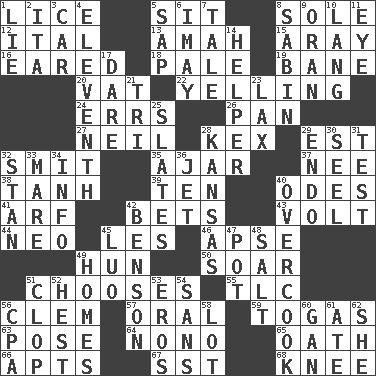ACROSS 1. Louse (plural) 5. Be seated 8. Not divided or shared with others 12. Slanted text style (abbr.) 13. Housemaid 15. Like ___ of sunshine 16. Having ears or earlike features 18. Diluted with white 19. Object of repulsion 20. Large container 22. Crying or shouting loudly 24. Blunders 26. Baking dish 27. Famous astronaut Armstrong 28. Dry husk or covering 29. Eastern Standard Time (abbr.) 32. Stricken, poetically 35. Partly open 37. Born 38. Hyperbolic tangent 39. Nine, plus one 40. Lyric poems 41. Sandy's bark 42. Stakes 43. Electrical Unit 44. Modern: prefix 45. French article 46. Domed church section 49. Attila the _ 50. Fly high 51. Elects 55. Affectionate concern, for short 56. Clement's nick name 57. Relating to the mouth 59. Ancient Roman robes 63. Introduce or present, as a question 64. Words to Nanette 65. Pledge 66. Tenement units (abbr.) 67. Fast jet (abbr.) 68. Leg joint DOWN 1. Falsehood 2. Call ___ day 3. Automobile 4. Veterans Day date 5. Plant excrement 6. "If ____ say so..." 7. Story 8. Unit of acoustic absorption 9. Northwest Algerian city 10. Long (Scottish) 11. Sight organ 14. Aide 17. Have the gumption 21. Three (prefix) 23. Not strict 25. Chalkboards 28. Sunflower state 29. Inside; within (prefix) 30. Sew up the eyelids of hawks and falcons 31. Trial 32. Comedian Laurel of Laurel & Hardy 33. Female horse 34. A message received and understood 36. Passenger plane 40. Burn the roast 42. Gillaume's butler role 45. Nilotic language 47. Cooking vessel 48. Table seasoning 49. Dwellings 51. Hoof sound 52. Behest 53. Greek god of love 54. Without 56. Accounting whiz (abbr.) 58. Car dealer's back yard 60. Separate the seeds from cotton 61. Had dinner 62. A female animal or person