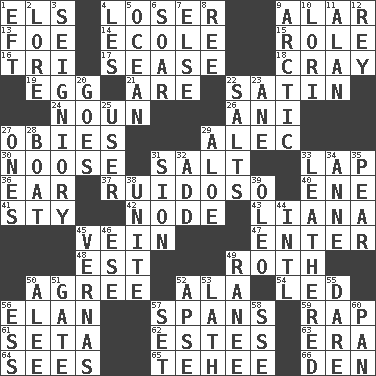 ACROSS 1. Raised railways 4. Failure 9. Having or resembling wings 13. Enemy 14. Learning spot: Fr. 15. Hero or heavy, e.g. 16. Three (prefix) 17. Gospel singer Marvin 18. Supercomputer manufacturer 19. Ovum 21. "We ___ not amused" (Victoria) 22. Smooth fabric 24. Part of speech 26. Cuckoo 27. Off-Broadway awards 29. Actor Baldwin 30. Trap for birds or small mammals 31. Table seasoning 33. Infant locale 36. Ewer handle 37. Boisterous (Brazilian Portuguese) 40. Compass dir. 41. Filthy place 42. Thickened enlargement 43. Climbing, woody, usually tropical vines 45. Distinctive style or manner 47. Keyboard key 48. Eastern Standard Time (abbr.) 49. Writer of Portnoy's Complaint (1969) 50. Match 52. Insect wing 54. Directed 56. Enthusiasm 57. Connects, as a bridge 59. Hit sharply and swiftly 61. Bristle 62. _____ Park, CO 63. Epoch 64. Perceives with the eye 65. Giggle 66. Lair DOWN 1. Lizard (obsolete) 2. Old wives' tales, e.g. 3. Signiory (variant) 4. French article 5. Sea 6. Fly high 7. Otherwise 8. To sift 9. Northern region 10. Australian parrot (variant) 11. Actor Alda or Thicke 12. Marina Del _, California 20. Moves 22. Table seasonings 23. A saturated hydrocarbon 25. One who makes use of a thing 27. Singles 28. Water vessel 29. _ vera 31. The Jewish people; Israel 32. Increase 33. Tough but pliablecoriaceous 34. Queen of England 1702-14 35. Lightbulb-shaped fruit 38. Join together 39. Butter sub 44. International (abbr.) 45. Actresses Bloom and Felton 46. Compass dir. 49. Indian princess (variant) 50. Toward shelter 51. Yard entry 52. Domed church section 53. Thin strip of wood or metal 55. Have the gumption 56. Curvy letter 57. Put into a specified state 58. Compass dir. 60. Baking dish
