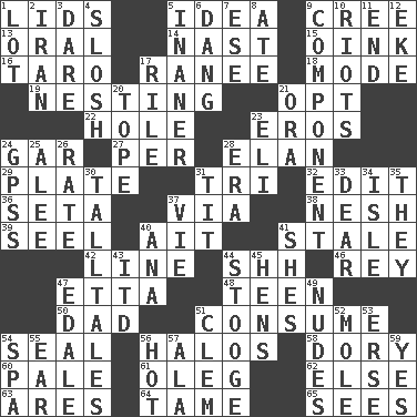 ACROSS 1. Hats (slang) 5. The main thing one is thinking about 9. Algonquian 13. Relating to the mouth 14. Political cartoonist Thomas 15. Pig sound 16. Pacific island yam 17. The wife of a rajah (variant) 18. Method 19. Inhabiting a nest 21. Choose 22. Hollow 23. Greek god of love 24. Slender fish 27. For each 28. Liveliness 29. Food holder 31. Three (prefix) 32. Prepare for publication 36. Bristle 37. By way of 38. Soft 39. Stitch closed the eyes of (a falcon) 40. Small island 41. Showing deterioration from age 42. Actor's bit 44. Quiet! 46. Marina Del _, California 47. Singer James 48. Adolescent 50. June honoree 51. Eat 54. Lick closed 56. Rings 58. Rowboat 60. Diluted with white 61. Cassini of fashion 62. Otherwise 63. Ancient Greek god of war 64. Not wild 65. Perceives with the eye DOWN 1. Car dealer's back yard 2. SW Asia republic 3. Have the gumption 4. Splash clumsily 5. More lacking in sense or substance 6. Mild oath, euphamism for damn 7. Compass dir. 8. Had dinner 9. Part 10. Disturbances 11. Conclude 12. Supplement with great effort 17. Cause heat under the collar 20. Drink excessively 21. Mouth or opening 23. Connecticut Ivy Leaguer 24. Global Positioning Systems (abbr.) 25. Toward shelter 26. Pace 28. Period 30. Baron Munchausen's specialties 31. Teat (slang) 33. Letter starter 34. Capri or Wight 35. Those people 37. Compete 40. Santa ___, CA 41. "______ My Girl" (Turtles hit) 43. It would 44. Moe Howard, for one 45. Coop moms 47. Peak District village in England 49. Unadorned figures 51. Clement's nick name 52. Undercover agent 53. Celtic language 54. Health resort 55. Ewer handle 56. Being at a high temperature 57. According to 59. Affirmative reply