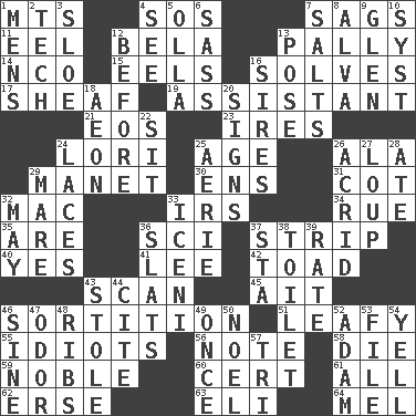 ACROSS 1. Mountains (abbr.) 4. Distress signal 7. Droops 11. Snakelike fish 12. Actor Lugosi 13. Chummy 14. Non-commissioned officer (abbr.) 15. Snakelike fish 16. Finds the solution 17. To gather and bind into a bundle 19. Helper 21. Greek goddess of the dawn 23. Angers 24. Australian parrot (variant) 25. Personal question 26. In the manner of 29. French painter Edouard 30. Followers of ems 31. Small bed 32. Big _ 33. Big collection agency 34. Regret 35. "We ___ not amused" (Victoria) 36. _-fi 37. Remove all contents or possession from 40. Affirmative reply 41. Area sheltered from the wind 42. Frog relative 43. Examine hastily 45. Small island 46. Decision 51. Like summer trees 55. Foolish or stupid persons 56. Observe 58. Expire 59. Impressive in appearance 60. An absolute certainty 61. Everything 62. Celtic language 63. Biblical high priest 64. Cartoonist voice _ Blanc DOWN 1. Not women's 2. Technician 3. _ gin 4. Perceive with the eye 5. Water jar 6. Backtalk 7. Table seasonings 8. Inventor's middle name 9. Small, secluded valley 10. System (abbr.) 12. Prior to 13. Airs 16. Titles for men of rank and authority 18. Period of immesurable duration 20. Omens 22. Be seated 24. Shoestrings 25. Nest on high 26. Bitter 27. Central Nebraska county 28. Had dinner 29. Female horse 32. Can I? 33. Ancient Celtic tribe of eastern Britain 36. Narrow boards 37. R.R. building 38. Bathroom 39. Assign a rank or rating to 43. Fur scarf 44. Quote 46. Trig term 47. Scent 48. Teases 49. At one time in the past 50. Christmas carol 52. First man 53. Do some clerical work 54. Shout 57. Three (prefix)