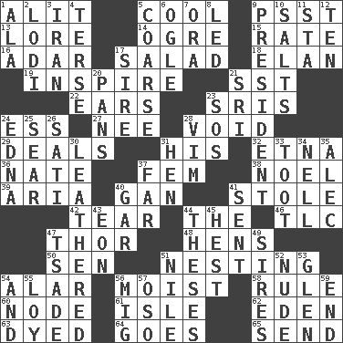 ACROSS 1. Set down 5. Calm and collected 9. Inconspicuous attention getter 13. Old wives' tales, e.g. 14. Legendary monster 15. Pace 16. The sixth month of the Jewish calendar 17. First course 18. Style 19. Motivate 21. Fast jet (abbr.) 22. Hearing organs 23. Indian titles of respect 24. Curvy letter 27. Born 28. Null 29. Allots cards 31. Part of HMS, perhaps 32. Inactive volcano in Sicily 36. Nathan's nickname 37. Opposite of masc. 38. Christmas carol 39. Operatic vocal solo 40. Separate the seeds from cotton 41. Fur scarf 42. Rend 44. Definite Article 46. Affectionate concern, for short 47. Son of Odin 48. Coop moms 50. Elected rep. 51. Nestling 54. Having or resembling wings 56. Damp 58. Governing power 60. Thickened enlargement 61. Capri or Wight 62. Genesis locale 63. Colored 64. Moves 65. Transmit DOWN 1. Insect wing 2. Farming town in central California 3. SW Asia republic 4. Laconic 5. Rough 6. Stare 7. Mouth or opening 8. Directed 9. Elected leader of a country 10. Table seasonings 11. R.R. building 12. "___ Little Indians" 17. Title for a man of rank and authority 20. Zero-star reviews 21. _ Lanka 23. Mayday 24. Pulitzer Prize-winning author Ferber 25. Wither 26. Suttee (variant) 28. Zeal 30. Tough but pliablecoriaceous 31. Layer 33. A blast of a horn 34. 1994 drama film starring Jodie Foster 35. Actor Baldwin 37. Distant 40. Slender fish 41. Posted 43. A really long time 44. College papers 45. Command 47. Sadhe (variant) 49. Begets 51. The longest river in the world 52. Unadorned 53. Small, secluded valley 54. Plus 55. Myrna of the movies 56. Russian fighter aircraft 57. Bear (Spanish) 59. Conclude