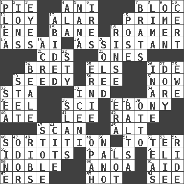 ACROSS 1. Sliced dessert 4. Cuckoo 7. Coalition 11. Myrna of the movies 12. Having or resembling wings 13. A-one 14. Compass dir. 15. Object of repulsion 16. Wanderer 17. Slender Brazilian palm 19. Aide 21. Music discs 23. Washington bills 24. Cy Young winner Saberhagen 25. Raised railways 26. Binary compound 29. Morally degraded 30. To separate or throw off 31. At this time 32. R.R. building 33. Indiana (abbr.) 34. "We ___ not amused" (Victoria) 35. Snakelike fish 36. _-fi 37. Black 40. Had dinner 41. Area sheltered from the wind 42. Pace 43. Examine hastily 45. Keyboard modifier key 46. Casting lots 51. Carrier 55. Foolish or stupid persons 56. Friends 58. Connecticut Ivy Leaguer 59. Having high moral qualities 60. Small Philippine buffalo 61. Assist 62. Celtic language 63. Being at a high temperature 64. Perceive with the eye DOWN 1. Entreaty 2. Charged particles 3. Snake ____ (dice throw) 4. According to 5. Grandmother 6. Angers 7. Naughty children 8. Pale green bean 9. Presage 10. An absolute certainty 12. Tolerated 13. Introduce or present, as a question 16. Wash lightly 18. Measure of real estate 20. Having a sole or soles 22. Filthy place 24. Memphis, Tenn. Street 25. Bert's buddy 26. Empty; void 27. Small, narrow, flatbottom fishing boat 28. She-sheep 29. Proofreading order 32. Ocean 33. Ancient Celtic tribe of eastern Britain 36. Narrow boards 37. Period 38. Greek mezzo-soprano Agnes 39. "Beetle Bailey" pooch 43. Took without asking 44. Quote 46. Trig term 47. Aroma 48. Teases 49. Brightly colored fish 50. Billionth: prefix 52. Afternoon social gatherings 53. Writer Wiesel 54. Travel on an animal 57. Car dealer's back yard