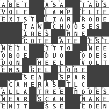 ACROSS 1. Collude with 5. White ___ sheet 8. Small boys 12. Grand slam 13. Desk light 15. Writer Wiesel 16. Be 18. One who doesn't tell the truth 19. Loose flowing garment 20. The 23rd letter of the Hebrew alphabet 22. Opts 24. Angers 26. Compass dir. 27. ____ d'Azur (French Riviera) 28. Had dinner 29. Eastern Standard Time (abbr.) 32. Famous astronaut Armstrong 35. "Tell ____ the Marines!" 37. Born 38. Mitch Miller's instrument 39. Superhero pair 40. Lyric poems 41. Spanish title 42. The bottom of a shoe or boot 43. Electrical Unit 44. Followers of ems 45. Set 46. Ear part 49. Ocean 50. Practice fight 51. Devices for capturing images 55. Affectionate concern, for short 56. Silent film actress Nazimova 57. Woody plant 59. Methods 63. Put on (as clothing) 64. Examine hastily 65. Cause to be 66. Give off 67. Compass dir. 68. Locale of original sin DOWN 1. "___ Maria" 2. Gift holder 3. Biblical high priest 4. One of the two male reproductive glands 5. Everything 6. Ketch in the Levant 7. Housemaid 8. Laconic 9. _ vera 10. Rights 11. Observe 14. Right away 17. Edible starchy tuberous root 21. Dripping 23. Single 25. Beer mug 28. Ringlike coral islands and reefs 29. Inside; within (prefix) 30. Sew up the eyelids of hawks and falcons 31. Trial 32. Connecting point 33. Inky black, to poets 34. Charged particles 36. Third day of the wk. 40. Conquer 42. Centers of feelings and intuitions 45. Unit of force equal to gravity 47. Choose 48. Lip ointment 49. Don Adams' spy role 51. Clement's nick name 52. Jai _ 53. Arches 54. Oceans 56. Deep reverence 58. Compass dir. 60. Male parent 61. Supplement with great effort 62. Elected rep.