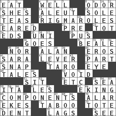 ACROSS 1. Ingest 4. Water source 8. Aroma 12. "______ My Girl" (Turtles hit) 14. Eskimo relative 16. Not divided or shared with others 17. Beverages made from leaves 18. Complicated, petty procedures 20. Having ears or earlike features 22. Before (prefix) 23. Small child 24. Begley and Asner 25. Corn or form start 28. Fluid product of inflammation 30. Leaves 31. Memphis, Tenn. Street 35. Not either 37. Actor Alda or Thicke 40. Greek god of love 41. "Two Mules for Sister ____" 42. Prying instrument 44. Component 45. Fastener 46. Edible starchy tuberous root 47. Sight organ 48. Lies 50. Nothingness 52. Be seated 54. And so on (abbr.) 55. Ocean 58. Call ___ day 61. French article 63. Supplementing with great effort 65. Parts 70. Having or resembling wings 71. Supplements with great effort 72. Off limits 73. Carry 74. Undesirable depression on a surface 75. Falls behind 76. Perceive with the eye DOWN 1. First name in cosmetics 2. At or in the front 3. Separates forcefully 4. Armed conflict 5. Biblical high priest 6. Part of a journey 7. Mass 8. Bear (Spanish) 9. Stupid person 10. Margarine 11. Relief 13. Compass dir. 15. Canvas cover 19. Reuben's nickname 21. Superhero pair 26. Actress Patricia 27. Small island 29. Oozed 30. Raisin fruits 32. Like ___ of sunshine 33. Old wives' tales, e.g. 34. Eastern Standard Time (abbr.) 35. Grandmother 36. Spoken 38. Actress Gardner 39. Boldness 41. Fast jet (abbr.) 43. Carrot, for example 49. Grain storage tower 51. Frozen water 53. Portable shelter 55. Grain storage towers 56. Maternal 57. Match 58. On the rocks 59. Casino tip 60. So be it 62. Lick closed 64. Krazy ___ of comics 66. Pacific Standard Time (abbr.) 67. Basketball assoc. 68. Coat; cloak 69. Distress signal