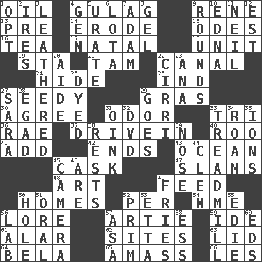 ACROSS 1. Petroleum 4. POW camp 9. French philosopher Descartes 13. Before (prefix) 14. Wear away 15. Lyric poems 16. Beverage made from leaves 17. Relating to or accompanying birth 18. A single undivided whole 19. R.R. building 21. Scottish cap 22. Lessep's creation 24. Flintstone garb 26. Working for oneself (abbr.) 27. Shabby and untidy 29. Pate de foie ____ 30. Match 31. Aroma 33. Three (prefix) 36. Actress Charlotte 37. Popular '50s hangout 40. Friend of Pooh 41. Say or write further 42. Extremities 43. Sea 45. Keg 47. Hits or strikes with great force 48. Tate display 49. Nourish 50. Residences 52. For each 54. Madame (abbr.) 56. Old wives' tales, e.g. 57. Nick name for Arthur 59. Binary compound 61. Having or resembling wings 62. Locates 63. Hat (slang) 64. Actor Lugosi 65. Collect or gather 66. French article DOWN 1. Elect 2. Angers 3. Resembling or made to resemble leather 4. Commissioned mil. rank 5. A salt of uric acid 6. Globular water bottle used in Asia 7. First of billions? 8. Set 9. Periods in a boxing match 10. Pulitzer Prize-winning author Ferber 11. Famous astronaut Armstrong 12. Eastern Standard Time (abbr.) 20. Assistant 22. High-altitude cloud 23. Santa ___, CA 25. Colored 27. "Two Mules for Sister ____" 28. Mild oath 29. Leaves 31. Pig sound 32. Movie disc 33. Excercise machine 34. Wander aimlessly 35. Charged atoms 38. Musical pauses 39. Olfactory organ 44. Clement's nick name 45. Device for capturing images 46. "We ___ not amused" (Victoria) 49. Strips of potato fried in deep fat 50. Hollow 51. Of the mouth 52. Demure 53. Singer James 55. Singer Brickell 56. Experiment locale 57. White ___ sheet 58. Double-curved letter 60. Begley and Asner