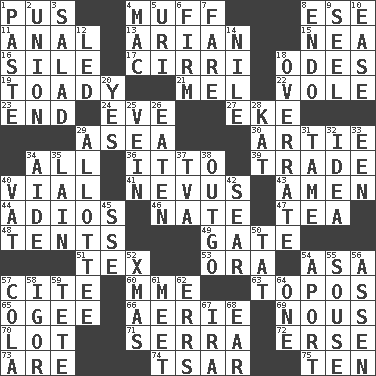 ACROSS 1. Product of festering 4. Perform or handle clumsily 8. Compass dir. 11. Of or related to the anus 13. Believer in; advocate of (suffix) 15. Teachers' org. 16. Filth; sediment 17. High-altitude cloud 18. Lyric poems 19. Sycophant 21. Cartoonist voice _ Blanc 22. Grand slam 23. Conclude 24. Night before a holiday 27. Make supply last 29. At sea 30. Nick name for Arthur 34. 100% 36. "Tell ____ the Marines!" 39. Swap 40. Small bottle 41. Mole, birthmark 43. So be it 44. Goodbye (Sp.) 46. Nathan's nickname 47. Beverage made from leaves 48. Portable shelters 49. Yard entry 51. John Ritter's dad 53. Mouth or opening 54. White ___ sheet 57. Quote 60. Madame (abbr.) 63. Literary convention 65. Double curve, resembling the letter S 66. Nest on high 69. Common sense 70. Car dealer's back yard 71. Spanish missionary in California 72. Celtic language 73. "We ___ not amused" (Victoria) 74. Russian ruler of old 75. "___ Little Indians" DOWN 1. Thick mixture 2. The state of being joined or united 3. First course 4. Apple computer (short form) 5. RI univ. 6. Unshakable 7. Conductor's collection 8. Inside; within (prefix) 9. Sew up the eyelids of hawks and falcons 10. Relaxation 12. Directed 14. Mediterranean tributary 18. Make much ado about nothing 20. Affirmative reply 25. Distinctive style or manner 26. Ingested 28. Krazy ___ of comics 29. One to whom something is allotted 31. Docile 32. The content of cognition 33. Car or cant ending 34. Helper 35. (Had) reclined 37. Federal power corp. 38. Money paid out 40. Large container 42. Singe 45. Compass dir. 50. Make lace 52. Dec. holiday 54. To the left, to Queeg 55. Boozer 56. NE Netherlands city 57. Root beer relative 58. Composer Stravinsky 59. Wig 61. Confront 62. Blunders 64. Single 67. Retirement account (abbr.) 68. Ewer handle