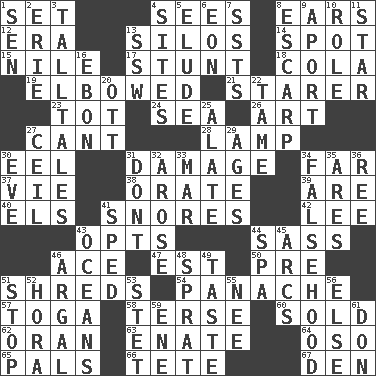 ACROSS 1. Put into a specified state 4. Observes 8. Hearing organs 12. Period 13. Grain storage towers 14. Specific locale 15. Mediterranean tributary 17. Difficult or unusual or dangerous feat 18. Root beer relative 19. Turned at an angle; bent 21. A viewer who gazes fixedly 23. Small child 24. Ocean 26. Tate display 27. Patter 28. Desk light 30. Snakelike fish 31. Break 34. At a great distance 37. Compete 38. Speak pompously 39. "We ___ not amused" (Victoria) 40. Raised railways 41. Sounds asleep 42. Area sheltered from the wind 43. Chooses 44. Backtalk 46. Adept person 47. Eastern Standard Time (abbr.) 50. Before (prefix) 51. Tears up 54. Flamboyance 57. Ancient Roman robe 58. Laconic 60. Exchanged or delivered for money 62. NW Algerian seaport 63. Related on the mother's side 64. Bear (Spanish) 65. Friends 66. False hair 67. Lair DOWN 1. Elected rep. 2. One of the Great Lakes 3. Baron Munchausen's specialties 4. Locates 5. Evade 6. A really long time 7. Fast planes 8. Fortification 9. To the left, to Queeg 10. Hero or heavy, e.g. 11. Play the lead 13. Compass dir. 16. Inky black, to poets 20. Baseball player Mel 22. Not wild 25. Having winglike extensions 27. To provide with a ceiling 29. Ripens 30. Night before a holiday 31. Do not 32. Came up 33. Make imperfect 34. It jiggles the polygraph 35. Ancient Greek god of war 36. Portuguese money of account (variant) 41. Broke a traffic law 43. Seas 44. Health resort 45. Curves 46. Therefore, facetiously 48. Small fatty European fish 49. Clothes sense 51. Close up, plug up 52. Israeli folk dance 53. Proofreading order 55. Born 56. Otherwise 59. Compass dir. 61. Spanish title