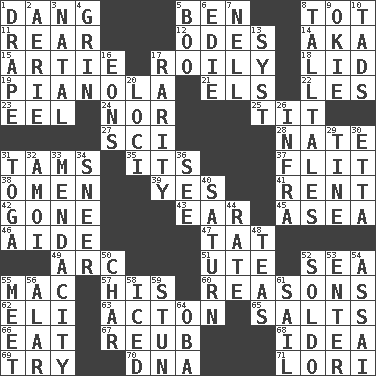 ACROSS 1. Mild oath, euphamism for damn 5. Benjamin's nick name 8. Small child 11. Located in or toward the back 12. Lyric poems 14. Alias (abbr.) 15. Nick name for Arthur 17. Agitated, as a liquid 18. Flaplike covering 19. Player piano 21. Raised railways 22. French article 23. Snakelike fish 24. Not either 25. Teat (slang) 27. _-fi 28. Nathan's nickname 31. Scottish caps 35. ___ a Wonderful Life 37. Secret move to avoid paying debts 38. Sign of something about to happen 39. Affirmative reply 41. Monthly bill 42. Went 43. Hearing organ 45. Toward the sea 46. Assistant 47. Make lace 49. Curve 51. Shoshoni 52. Ocean 55. Apple computer (short form) 57. Part of HMS, perhaps 60. Thinks logically 62. Biblical high priest 63. NE Massachussets city 65. Table seasonings 66. Erode 67. Reuben's nickname 68. The content of cognition 69. Attempt 70. Heredity factor (abbr.) 71. Australian parrot (variant) DOWN 1. Window treatment 2. Nest on high 3. Brizilian seaport 4. Broad smile 5. Sometimes accompanies a hiss 6. Singer Brickell 7. 1994 drama film starring Jodie Foster 8. Baron Munchausen's specialties 9. Migrant worker of the '30s 10. Small boys 13. System (abbr.) 16. Immeasurably long periods of time 17. Noteworthy scarcity 20. Event scenes 26. Kind of red light 29. Prong on a fork 30. Singer James 31. Ancient Roman robe 32. Mine, in Marseilles 33. Ananias' fault 34. Scornful expression 36. Observe 40. Titan orbits this 44. Pace 48. Afternoon social gatherings 50. Burn to charcoal 52. Twentieth part of a lira 53. Keyboard key 54. Slender Brazilian palm 55. Confront 56. Having or resembling wings 58. On the rocks 59. Make senseless or dizzy 61. Travel by water 64. Chief or king in Benin or Nigeria