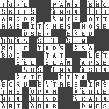 ACROSS 1. Torque (variant) 5. Zero-star reviews 9. English channel? 12. Atmospheres 14. Small Philippine buffalo 15. Luau accessory 16. Zeal 17. Sever or remove by pinching or nipping 18. Baseball player Mel 19. Actress Charlotte 20. Skin irritations 23. Flexible conduit 24. One who uses or employs something 25. Made supply last 27. Mouths or openings 30. Observe 32. Elected rep. 33. Hero or heavy, e.g. 34. Small boys 36. Girls' org. (abbr.) 38. Surprise greeting 39. Make lace 40. Allow 43. Snakelike fish 46. Style 48. Domed church section 49. Distress signal 51. Epoch 52. Toward the sea 53. Yard entry 54. Singer James 56. Shade of tan 58. Main course 61. Big collection agency 64. Definite Article 65. Brightly colored fish 66. Nest on high 68. Teachers' org. 69. Former U.S. Attorney General Janet 70. Any of the three canals of the cochlea 71. Nonscientific branch of learning 72. The sixth month of the Jewish calendar 73. Singles DOWN 1. Russian ruler of old 2. Gumbo ingredient 3. Travel on an animal 4. Corporate head (abbr.) 5. Romantic infatuation 6. Singer Murray 7. Annoying sounds 8. Plant excrement 9. Vital fluid 10. Wagers 11. Quote 13. Indian titles of respect 21. Trial 22. Cause to be 23. Coop moms 24. Purpose 26. Cask 27. Globe 28. Friend of Pooh 29. _ vera 31. Peak District village in England 35. A viewer who gazes fixedly 37. High mountains 41. Compass dir. 42. Beverage made from leaves 44. He sold his birthright 45. Car dealer's back yard 47. Nathan's nickname 48. American Automobile Association (abbr.) 50. Oozed 53. Relatively large 55. Beverages made from leaves 56. Inactive volcano in Sicily 57. "Mermaids" star 59. Nanny 60. Son of Odin 61. SW Asia republic 62. Cause heat under the collar 63. Oceans 65. Mouth or opening 67. Environmental prefix
