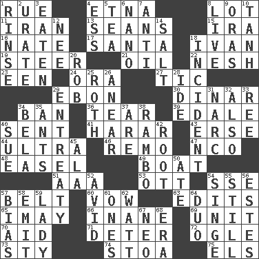 ACROSS 1. Regret 4. Inactive volcano in Sicily 8. Car dealer's back yard 11. SW Asia republic 13. Seines 15. Retirement account (abbr.) 16. Nathan's nickname 17. Before Barbara or Clara 18. "Terrible" tsar 19. Guide 21. Petroleum 22. Delicate 23. Car or cant ending 24. Mouth or opening 27. Nervous spasm 29. Inky black, to poets 30. Middle Eastern gold or silver currency 34. Forbid 36. Lacerate 39. Peak District village in England 40. Transmitted 41. Ethiopian city, capital of Harari 43. Celtic language 44. Extreme 46. San ____ (Riviera town) 47. Non-commissioned officer (abbr.) 48. Artist's stand 49. Water vessel 51. Auto club (abbr.) 53. Baseball player Mel 54. Compass dir. 57. Waist strap 60. Promise 63. Proofreads 65. "If ____ say so..." 66. Lacking in sense or substance 69. A single undivided whole 70. Assist 71. Prevent from occurring 72. Stare at amorously 73. Filthy place 74. Portico 75. Raised railways DOWN 1. Wash lightly 2. A salt of uric acid 3. Consumed 4. Double-curved letter 5. Beverage made from leaves 6. Billionth: prefix 7. Against 8. Not recorded 9. Mouths or openings 10. Hyperbolic tangent 12. Born 14. Table seasoning 18. Event 20. Director Reiner 25. Writer of Portnoy's Complaint (1969) 26. Approach 28. Binary compound 29. Plea 31. Drug cop 32. In addition 33. To riddle 34. Actor Lugosi 35. Pismires 37. "We ___ not amused" (Victoria) 38. Role for Stallone 40. Take to court 42. Carrot, for example 45. According to 50. Had dinner 52. Enthusiastic 54. Burn superficially 55. Not moving 56. _____ Park, CO 57. Prejudice 58. Send forth 59. Kenny Rogers chart-topper in '80 61. Washington bills 62. Electrical Unit 64. Superhero pair 67. Modern: prefix 68. Epoch