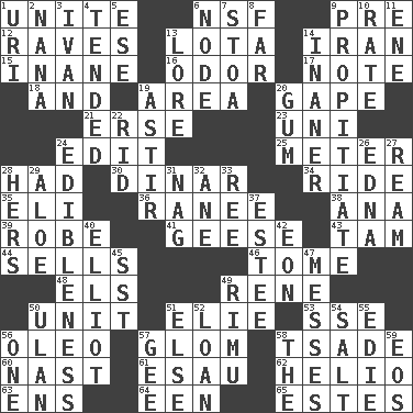ACROSS 1. Join together 6. Overdraft (abbr.) 9. Before (prefix) 12. All-night dance parties 13. Globular water bottle used in Asia 14. SW Asia republic 15. Silly 16. Aroma 17. Make mention of 18. Added to 19. Type of rug 20. Open wide 21. Celtic language 23. Corn or form start 24. Prepare for publication 25. Distance measurement 28. Possessed 30. Middle Eastern gold or silver currency 34. Travel on or in a vehicle 35. Biblical high priest 36. Indian princess (variant) 38. Santa ___, CA 39. Loose flowing garment 41. Honkers 43. Scottish cap 44. Makes a sale 46. Heavy book 48. Raised railways 49. French philosopher Descartes 50. A single undivided whole 51. Writer Wiesel 53. Compass dir. 56. Butter sub 57. Seize upon or latch onto something 58. Sadhe (variant) 60. Political cartoonist Thomas 61. He sold his birthright 62. Sun: prefix 63. Followers of ems 64. Car or cant ending 65. _____ Park, CO DOWN 1. RI univ. 2. Grandmother 3. _ the terrible 4. Watched over 5. Compass dir. 6. Connecting point 7. Portico 8. Distant 9. Conciliate 10. Assign a rank or rating to 11. Compass dir. 13. Old wives' tales, e.g. 14. More empty; more void 19. Moving or stirring 20. Chewing product 22. To free from 24. The property of being fit to eat 26. Pulitzer Prize-winning author Ferber 27. 480, 500 or 516 sheets of paper 28. Possessive pronoun 29. _ vera 31. Tired old horse 32. A saturated hydrocarbon 33. To separate or throw off 37. First name in cosmetics 40. American author Paul (1891-1958) 42. A really long time 45. Fast jet (abbr.) 47. Makes clutter 49. Tall New Zealand timber tree 50. Uhlan (variant) 51. Otherwise 52. Grant temporary use of 54. Table seasoning 55. Singer Brickell 56. Single 57. Unit of force equal to gravity 58. Definite Article 59. Greek goddess of the dawn