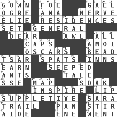 ACROSS 1. Bride's dress 5. Enemy 8. Highlander 12. Legendary monster 13. Wet nurse (var.) 14. Impudent aggressiveness 15. Writer Wiesel 16. Dwellings 19. Arrange properly for use 20. Commissioned military rank 21. Letter starter 23. Leather borer 24. Everything 27. Balmoral and tarboosh 30. Mine, in Marseilles 31. Motion picture awards 34. Necklace unit 35. Russian ruler of old 38. Arguments over trivial matters 40. Restaurants 41. Merit 42. Oozed 44. Pismires 45. Falsehood 46. Compass dir. 47. Atlas unit 50. Neighbor of Neb. 53. Motivate 57. Mouth edge 59. Supplying deficiencies 63. "Two Mules for Sister ____" 64. Lag or linger behind 65. Baking dish 66. Commotion 67. Assistant 68. Compass dir. 69. Gone DOWN 1. Travels 2. Stared 3. Compose 4. Born 5. Conductor's collection 6. Sign of something about to happen 7. Relaxation 8. Commissioned mil. rank 9. Curve 10. Night before a holiday 11. French article 14. 1994 drama film starring Jodie Foster 17. Retirement account (abbr.) 18. Simpleton 20. Pate de foie ____ 22. Oak nuts 24. So be it 25. Grant temporary use of 26. Hats (slang) 28. Personal Computers (abbr.) 29. Plant excrements 30. Tolerated 32. Actress Charlotte 33. Proofreading order 35. Beverages made from leaves 36. Without 37. Johnson of "Laugh-In" 39. Health resort 43. Otherwise 47. Place where flour is made 48. A saturated hydrocarbon 49. Pacific Standard Time (abbr.) 51. Having winglike extensions 52. Japanese brewing company 54. Corncob 55. _ the terrible 56. French philosopher Descartes 58. Role in a play 59. R.R. building 60. RI univ. 61. Writing tablet 62. Sliced dessert 63. Compass dir.
