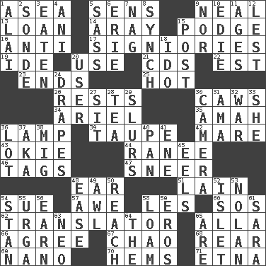 ACROSS 1. At sea 5. Elected reps. 9. Anneal 13. Grant temporary use of 14. Like ___ of sunshine 15. Porridge 16. Opposed to 17. Seigniories (variant) 19. Binary compound 20. Purpose 21. Music discs 22. Eastern Standard Time (abbr.) 23. Extremities 25. Being at a high temperature 26. Musical pauses 30. Crow sounds 34. Satellite of Uranus 35. Wet nurse 36. Desk light 39. Grayish beige 42. Female horse 43. Migrant worker of the '30s 44. The wife of a rajah (variant) 46. Labels 47. Contemptuous expression 48. Hearing organ 51. (Had) reclined 54. Institute legal proceedings 57. Deep reverence 58. French article 60. Mayday 62. Interpreter 65. Silent film actress Nazimova 66. Match 67. US Secretary of Labor Elaine L. _ 68. Tail end 69. Billionth: prefix 70. Folds over and sews together 71. Inactive volcano in Sicily DOWN 1. Mountain range southwest of Kyrgyzstan 2. Message 3. Ingested 4. Cuckoo 5. Backtalk 6. One of the Great Lakes 7. Tired old horse 8. Synchronize (abbr.) 9. Not either 10. Singer Brickell 11. Ripens 12. For fear that 15. Mail 18. Wedding promise 20. One who uses or employs something 24. Window treatments 27. Be seated 28. Afternoon social gathering 29. Runs notes together 30. Device for capturing images 31. Housemaid (var.) 32. Armed conflict 33. A female animal or person 36. Car dealer's back yard 37. Alias (abbr.) 38. Russian fighter aircraft 40. Baking dish 41. Compass dir. 45. Snakelike fish 48. Comfort 49. Leather borer 50. Arrive at 52. Small island 53. Pitcher Ryan 54. Comedian Laurel of Laurel & Hardy 55. Capital and largest city of Mongolia 56. Merit 58. Rich soil 59. Greek god of love 61. "Two Mules for Sister ____" 63. Modern: prefix 64. Definite Article 65. "We ___ not amused" (Victoria)