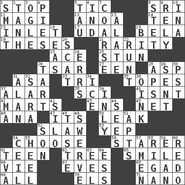 ACROSS 1. Cease 5. Nervous spasm 8. _ Lanka 11. Wise men 12. Small Philippine buffalo 14. Nine, plus one 15. An arm off of a larger body of water 17. Hereditary estate 18. Actor Lugosi 19. College papers 21. Noteworthy scarcity 23. Adept person 25. Astound 26. Russian ruler of old 27. Car or cant ending 28. Cleo's killer 31. White ___ sheet 33. Three (prefix) 35. Drinks excessively 37. Having or resembling wings 38. _-fi 40. Is not 41. Shops 43. Followers of ems 45. Fish or hair follower 46. Santa ___, CA 47. It is 50. Path through which fluid escapes 52. Cole _ (cabbage dish) 53. Slangy assent 54. Elect 56. A viewer who gazes fixedly 61. Adolescent 62. Woody plant 65. Grin 66. Compete 67. Nights before holidays 68. Mild oath 69. Everything 70. Raised railways 71. Billionth: prefix DOWN 1. Stricken, poetically 2. Hyperbolic tangent 3. Stare at amorously 4. Sliced desserts 5. The 19th letter of the Greek alphabet 6. Indiana (abbr.) 7. Unrefined 8. Proofreading order 9. Trust 10. _ tizzy (2 wds.) 13. Having winglike extensions 16. Beverages made from leaves 18. Storage container 20. Go away! 22. Undersized animal 24. Blunders 26. Small pie 28. Domed church section 29. Emitted 30. Pacific Standard Time (abbr.) 31. Actor Alda or Thicke 32. "Two Mules for Sister ____" 34. Frozen water 36. Pig sound 37. Housemaid (var.) 39. Inwardly 42. Grain storage tower 44. Perceives with the eye 48. Clothes sense 49. Turn aside suddenly 51. Tenement units (abbr.) 52. Male child 54. To provide with a ceiling 55. Person who is morally reprehensible 57. So be it 58. Capital of Latvia 59. Liveliness 60. Do over again 61. Federal power corp. 63. Snakelike fish 64. Curvy letter
