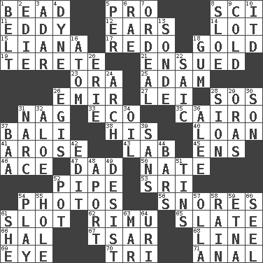 ACROSS 1. Necklace unit 5. Adept person 8. _-fi 11. Whirlpool 12. Hearing organs 14. Car dealer's back yard 15. Climbing, woody, usually tropical vines 17. Redecorate 18. Gilt 19. Cylindrical with tapered ends 21. Took place subsequently 23. Mouth or opening 25. First of billions? 26. Arab leader 27. Luau accessory 28. Distress signal 31. Tired old horse 33. Environmental prefix 35. Capital of Egypt 37. Indonesian resort city 38. Part of HMS, perhaps 40. Grant temporary use of 41. Came up 43. Experiment locale 45. Followers of ems 46. Adept person 47. June honoree 50. Nathan's nickname 52. Corncob 53. Indian title of respect (Mr.) 54. Pictures 56. Sounds asleep 61. Slit 62. Tall New Zealand timber tree 65. Schedule 66. Actor Linden 67. Russian ruler of old 68. Actor's bit 69. Sight organ 70. Three (prefix) 71. Of or related to the anus DOWN 1. Waist strap 2. Singer Brickell 3. The sixth month of the Jewish calendar 4. Centimeter-gram-second unit of force 5. For each 6. Actress Charlotte 7. Severe or trying experience 8. _ gin 9. Chilled 10. It would 13. Something which is sent 16. Tiny particle 18. Chewing product 20. 4th largest of the Great Lakes 22. Ketch in the Levant 24. Bowlike part 26. Armor plate that protects the chest 28. The Jewish people; Israel 29. Mouths or openings 30. Male offspring 31. Drug cop 32. Medicinal plant 34. Petroleum 36. Toward shelter 37. Sound made by sheep 39. Without 42. Prepare for publication 44. Taverns 48. To the left, to Queeg 49. Cease 51. Canisters 52. Cooking vessel 54. Shaw product 55. Hollow 57. Spanish pot 58. Precipitation 59. Inactive volcano in Sicily 60. Stitch closed the eyes of (a falcon) 61. A female animal or person 63. Third mo. 64. RI univ.