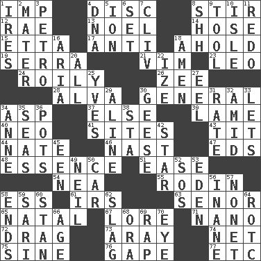 ACROSS 1. Mischievous child 4. Flat circle 8. Use a swizzle stick 12. Actress Charlotte 13. Christmas carol 14. Flexible conduit 15. Singer James 17. Against 18. Hold, grip (Informal) 19. Spanish missionary in California 21. Zeal 23. Lion 24. Turbulent 26. Last letter of the English alphabet 28. Inventor's middle name 30. Commissioned military rank 34. Viper 37. Otherwise 39. Unable to walk 40. Modern: prefix 41. Locates 43. Teat (slang) 44. Nathan's nickname 46. Political cartoonist Thomas 47. Begley and Asner 48. Gist 51. Comfort 54. Teachers' org. 55. "The Thinker" sculptor 58. Curvy letter 61. Big collection agency 63. Sir (Sp.) 65. Brizilian seaport 67. Old wives' tales, e.g. 71. Billionth: prefix 72. To draw with force 73. Like ___ of sunshine 74. Remaining after all deductions 75. Trig term 76. Stare wonderingly 77. And so on (abbr.) DOWN 1. Angers 2. Mother 3. Stone: prefix 4. Heredity factor (abbr.) 5. Electrically charged atom 6. Put into a specified state 7. 154 in Roman numerals 8. Quiet! 9. Implement 10. Small island 11. Make new 16. Roberta Peters solo 18. So be it 20. Everything 22. Ending with capital 25. Jacques Cousteau's middle name 27. Snakelike fish 29. Place in a line 30. Honkers 31. Assign a rank or rating to 32. Among 33. Allows 34. Queen of England 1702-14 35. Oceans 36. Plant holders 38. R.R. building 42. Play the lead 45. Car or cant ending 49. Famous astronaut Armstrong 50. Auto 52. Mayday 53. Genesis locale 56. Silly 57. Music written for nine 58. Extremities 59. Indian skirt 60. Comedian Laurel of Laurel & Hardy 62. Volcanic refuse 64. College mil. group 66. Personal question 68. Mouth or opening 69. Strike 70. Sight organ