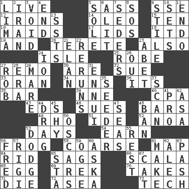 ACROSS 1. Moving, as bait 5. Backtalk 9. Compass dir. 12. Removes the wrinkles 14. Margarine 15. "___ Little Indians" 16. Women servants 17. Flaplike coverings 18. It would 19. Added to 20. Cigar-shaped 23. In addition 24. Capri or Wight 25. Loose flowing garment 27. San ____ (Riviera town) 30. "We ___ not amused" (Victoria) 32. Take to court 33. NW Algerian seaport 34. Religious women 36. It is 38. Tavern 39. Compass dir. 40. Accounting whiz (abbr.) 43. Begley and Asner 46. Takes to court 48. Oblong pieces of solid material 49. 17th letter of the Greek alphabet 51. Binary compound 52. Small Philippine buffalo 53. 24-hour periods 54. Merit 56. Toadlike animal 58. Unrefined 61. Atlas unit 64. To free from 65. Droops 66. Any of the three canals of the cochlea 68. Oval reproductive body of a fowl 69. Long journey 70. Receives possession of 71. Expire 72. At sea 73. Technology DOWN 1. Pale green bean 2. SW Asia republic 3. Lacking any legal or binding force 4. Conclusion 5. Flatfish 6. Set down 7. Spring feasts 8. Mayday 9. Vertical member of a panel or frame 10. Arranges properly for use 11. Inside; within (prefix) 13. Fast planes 21. Liveliness 22. Summer TV shows 23. Collude with 24. Electrically charged atom 26. Fr. "Yes" 27. Director Reiner 28. Period 29. Female horse 31. World-weariness 35. Sowing specialist 37. Examine hastily 41. Adept person 42. White ___ sheet 44. To draw with force 45. Like a shrinking violet 47. Oceans 48. Prohibit 50. Motion picture awards 53. Evade 55. Repose 56. Flintstone 57. Swiss mountan, "Queen of the Mountains" 59. Double curve, resembling the letter S 60. "____ silly question..." 61. Cause to be 62. Actor Baldwin 63. Romantic infatuation 65. R.R. building 67. Feline
