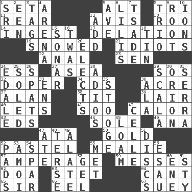 ACROSS 1. Stalk of a moss capsule 5. The first octave above the treble staff 8. Three (prefix) 11. Tail end 12. Opinion 13. Friend of Pooh 14. Eat 17. Conveyance 19. Overwhelmed 21. Foolish or stupid persons 22. Of or related to the anus 23. Elected rep. 24. Double-curved letter 27. Toward the sea 29. Distress signal 32. Drug addict 34. Music discs 36. 1/640 square mile 37. Actor Alda or Thicke 38. Teat (slang) 39. Den 40. Allows 41. "Barney Miller" actor Jack 42. Bodily heat indicating an inflammation 43. Begley and Asner 44. Not divided or shared with others 46. Santa ___, CA 47. _ moment's notice (2 wds.) 50. Gilded 52. Soft color 55. Ear of corn 57. Electrical Measurement 59. Makes clutter 62. ___ good deed 63. Proofreading order 64. Patter 65. Title for a knight 66. Snakelike fish 67. Chop _ DOWN 1. _ Lanka 2. Car or cant ending 3. Labels 4. Sports stadium 5. "___ Maria" 6. Ms. Damita and namesakes 7. Sadhe (variant) 8. Musical group of three 9. Carrot, for example 10. Charged atoms 12. Find the sum of 15. Underwater navigation system 16. It was, poetically 18. Shallow baking pan 20. Opts 24. Peak District village in England 25. Having a sole or soles 26. Arguments over trivial matters 28. Goodbye (Sp.) 29. Any of the three canals of the cochlea 30. Greek mythologigal hunter 31. Spanish missionary in California 33. Followers of ems 35. Moe Howard, for one 36. In the manner of 42. Cell (Danish) 45. Rich soil 47. Had dinner 48. Laconic 49. Having winglike extensions 51. Flat circles 52. Writing tablets 53. Mine, in Marseilles 54. Practice fight 55. Was introduced to 56. He sold his birthright 58. Set 60. Compass dir. 61. Filthy place