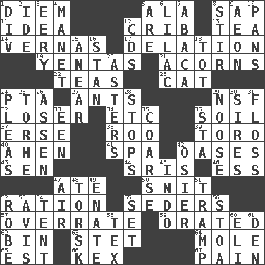 ACROSS 1. South Vietnam president (1954) 5. Wing 8. Plant excrement 11. The main thing one is thinking about 12. Baby bed with high sides 13. Afternoon social gathering 14. Actresses Bloom and Felton 17. Conveyance 19. Gossips 21. Oak nuts 22. Afternoon social gatherings 23. Domesticated feline 24. Parent Teacher Assoc. 27. Pismires 29. Science/research agcy. 32. Failure 34. And so on (abbr.) 36. Land 37. Celtic language 38. Friend of Pooh 39. "Corrida" creature 40. So be it 41. Health resort 42. Fertile tracts in a desert 43. Elected rep. 44. Indian titles of respect 46. Double-curved letter 47. Had dinner 50. In a ____ (agitated or irritated) 52. Food allowance for one day 55. Spring feasts 57. Make much ado about nothing 59. Declaimed 62. Storage container 63. Proofreading order 64. Undercover agent 65. Eastern Standard Time (abbr.) 66. A weed 67. Ache DOWN 1. HTML Container Element 2. Binary compound 3. Suggestive of the supernatural 4. French painter Edouard 5. "We ___ not amused" (Victoria) 6. Pale purple color 7. Phillipine bananalike plant 8. Commotion 9. A really long time 10. Baking dishes 12. Music discs 15. Approach 16. Comedian Laurel of Laurel & Hardy 18. Small child 20. Michaelmas daisies 24. Entreaties 25. Singer Mel 26. NE Netherlands city 28. Ceases 29. Trap for birds or small mammals 30. Fathers 31. Soft thread for cleaning between teeth 33. Car or cant ending 35. Rough 36. R.R. building 42. Flexible twig of a willow tree 45. _ china 47. Wind 48. Cod relative 49. Related on the mother's side 51. _____ steamer (cargo ship) 52. Loose flowing garment 53. Deliberation 54. Portable shelter 55. Arrange properly for use 56. Portico 58. John Ritter's dad 60. Biblical high priest 61. Lair