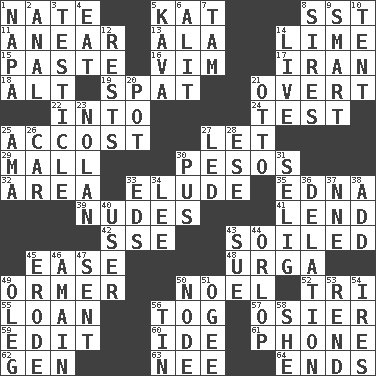 ACROSS 1. Nathan's nickname 5. Krazy ___ of comics 8. Fast jet (abbr.) 11. Approach 13. Chicken ___ king 14. Citrus frut 15. Thick mixture 16. Zeal 17. SW Asia republic 18. The first octave above the treble staff 19. Argument over a trivial matter 21. Unconcealed 22. To the inside or interior of 24. Trial 25. Buttonhole 27. Allow 29. Promenade 30. Mexican monetary units 32. Type of rug 33. Dodge 35. Pulitzer Prize-winning author Ferber 39. Unclothed pictures 41. Grant temporary use of 42. Compass dir. 43. Dirtied 45. Comfort 48. Capital and largest city of Mongolia 49. Abalone 50. Christmas carol 52. Three (prefix) 55. Grant temporary use of 56. Coat; cloak 57. Flexible twig of a willow tree 59. Prepare for publication 60. Binary compound 61. Give a jingle 62. Commissioned mil. rank 63. Born 64. Conclusions DOWN 1. California wine valley 2. Of or related to the anus 3. One of the two male reproductive glands 4. Ingest 5. Polynesian shrub of the pepper family 6. Set down 7. Scottish cap 8. Titles for men of rank and authority 9. Don Adams' spy role 10. Portable shelter 12. Musical pauses 14. Not recorded 20. Plant holder 21. "Beetle Bailey" pooch 23. Pitcher Ryan 25. Housemaid (var.) 26. 4-wheeled motor vehicle 27. Directed 28. Compass dir. 30. Fluid product of inflammation 31. Major League Baseball Commissioner Bud 33. Begley and Asner 34. Area sheltered from the wind 36. Accusation by an informer 37. Compass dir. 38. Increase 40. One who uses or employs something 43. Take to court 44. Lowest deck of a ship 45. Wear away 46. At full speed 47. Posted 49. Cassini of fashion 50. Thickened enlargement 51. Double curve, resembling the letter S 53. Tear apart 54. Angers 56. Shallow baking pan 58. A female animal or person