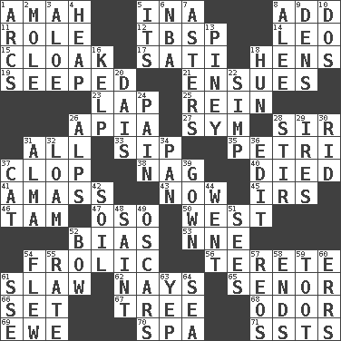 ACROSS 1. Nursemaid 5. _ tizzy (2 wds.) 8. Find the sum of 11. Hero or heavy, e.g. 12. Cook's measure (abbr.) 14. Lion 15. Covering 17. Suttee (variant) 18. Coop moms 19. Oozed 21. Takes place subsequently 23. Pet locale 25. It's straight from the horse's mouth 26. Capital of Western Samoa 27. Symbol (abbr.) 28. Title for a knight 31. 100% 33. Small drink 35. _ dish (used to culture cells) 37. Hoof sound 38. Tired old horse 40. Passed on 41. Collect or gather 43. At this time 45. Big collection agency 46. Scottish cap 47. Bear (Spanish) 50. Compass direction 52. Prejudice 53. Compass dir. 54. Romp 56. Cigar-shaped 61. Cole _ (cabbage dish) 62. Negative votes 65. Sir (Sp.) 66. Arrange properly for use 67. Family _ (genealogy) 68. Aroma 69. She-sheep 70. Health resort 71. Fast planes DOWN 1. Arches 2. Undercover agent 3. _ vera 4. Pile 5. ___ a Wonderful Life 6. Basketball assoc. 7. Michaelmas daisies 8. Toward shelter 9. Hiding places for outlaws 10. Two (Sp.) 13. Abounding in pines 16. Seaweed 18. Attila the _ 20. Raised platform 22. Simple or foolish person 24. Ache 26. High mountains 28. Agitate 29. Angers 30. To free from 31. _ mater 32. Rich soil 34. Baking dish 36. Prepare for publication 37. Feline 39. Bride's dress 42. Land 44. Left 48. Virtuous person 49. Motion picture awards 51. Observes 52. Arrow shooter 54. Soared 55. Pace 57. Vintage cars 58. Extremities 59. A blast of a horn 60. Blunders 61. Compass dir. 63. Slangy assent 64. Ocean