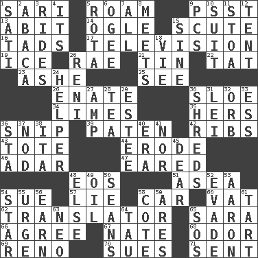ACROSS 1. Indian skirt 5. Wander 9. Inconspicuous attention getter 13. "This won't hurt ____!" 14. Stare 15. Turtle shell scale 16. Small boys 17. Boob tube 19. Frozen water 20. Actress Charlotte 21. Metal container 22. Make lace 23. American tennis player Robert 25. Perceive with the eye 26. Maternal 30. _ gin 34. Citrus fruits 35. Possessive pronoun 36. Sever or remove by pinching or nipping 39. Eucharist need 42. Teases 43. Haul 44. Wear away 46. The sixth month of the Jewish calendar 47. Having ears or earlike features 48. Greek goddess of the dawn 51. At sea 54. Institute legal proceedings 57. Untruth 58. Auto 60. Large container 62. Interpreter 65. "Two Mules for Sister ____" 66. Match 67. Nathan's nickname 68. Aroma 69. Western Nevada city 70. Institutes legal proceedings 71. Emitted DOWN 1. Suttee (variant) 2. Phillipine bananalike plant 3. Amusement-park features 4. ___ a Wonderful Life 5. Roll call or roster of names 6. Double curve, resembling the letter S 7. 100% 8. Confronts 9. Personal Computers (abbr.) 10. Set of matching outer garments 11. Portico 12. Portable shelter 15. Trig term 18. Compete 20. Painter Guido (1575-1642) 24. Aide 27. Electrical Unit 28. Afternoon social gathering 29. First name in cosmetics 30. Tears up 31. Luau accessory 32. Globe 33. Double-curved letter 36. R.R. building 37. Allow head to fall sleepily 38. Call ___ day 40. Period 41. Not either 45. Letter starter 48. Otherwise 49. Lubricate 50. Seines 52. Dodge 53. Composer Copland 54. Play the lead 55. Goad 56. Merit 58. ____ d'Azur (French Riviera) 59. Ancient Greek god of war 61. Small pie 63. Modern: prefix 64. The 19th letter of the Greek alphabet 65. Mayday