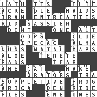 ACROSS 1. Thin strip of wood or metal 5. ___ a Wonderful Life 8. Writer Wiesel 12. Land measure 13. Pass on 14. Women servants 15. SW Asia republic 16. Pleas 19. To free from 20. More lively and spirited 21. Gouge 23. Single 24. Keyboard modifier key 27. I made a mistake 30. A slight indication 31. Medicinal drug used to evoke vomiting 34. _ mater 35. Religious women 38. Relating to or accompanying birth 40. Atlas contents 41. Medicinal plant 42. Cylindrical with tapered ends 44. Groovy apts. 45. Pull apart 46. A saturated hydrocarbon 47. Feline 50. Cause to be 53. Speakers 57. Lyricist Gershwin 59. Supplying deficiencies 63. Tree-dwelling hopper 64. N. Chile seaport 65. Lair 66. Travel on an animal 67. Sliced desserts 68. Compass dir. 69. Washington bills DOWN 1. Den 2. Bitter 3. Buy and sell 4. Layer 5. It may be bright or harebrained 6. Metal containers 7. Puts into a specified state 8. Erode 9. Cards in a Roman deck? 10. Binary compound 11. Curvy letter 14. Female horse 17. River (Sp.) 18. Car or cant ending 20. Cease 22. Annoying sounds 24. Silent film actress Nazimova 25. Mass 26. Afternoon social gatherings 28. Fenced enclosure 29. Get outta here! 30. Device for capturing images 32. Had dinner 33. Heavy open wagon 35. California wine valley 36. Uhlan (variant) 37. Connecting point 39. Area sheltered from the wind 43. Scottish caps 47. Root beer relative 48. "We ___ not amused" (Victoria) 49. Make lace 51. Japanese brewing company 52. Wear away 54. Event that recurs at intervals 55. Baking chamber 56. French philosopher Descartes 58. Grows older 59. Plant excrement 60. RI univ. 61. Sliced dessert 62. Personal Computers (abbr.) 63. From